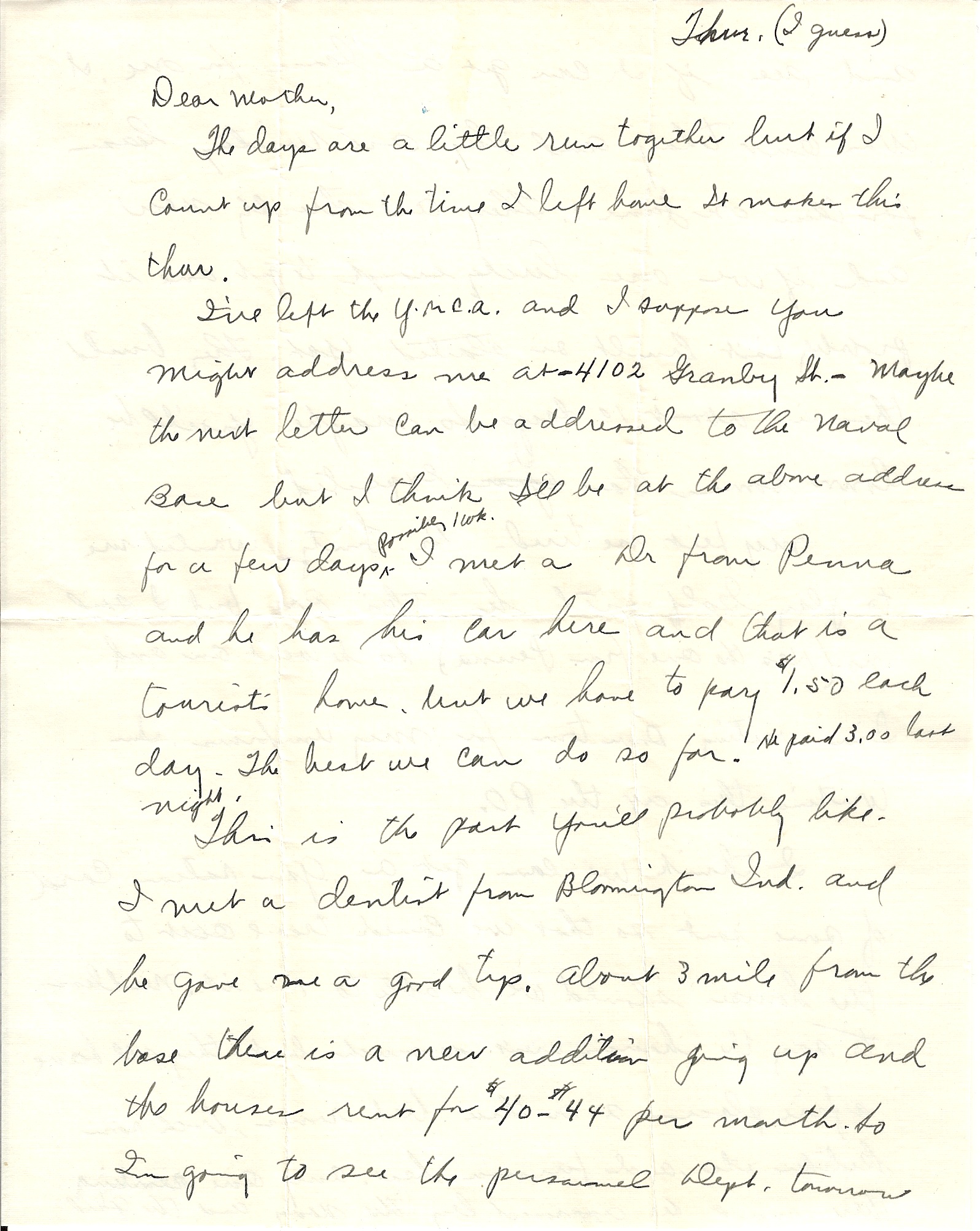 I’ve left the Y.M.C.A.  and I suppose you might address me at – 4012 Granby St.- Maybe the next letter can be addressed to the naval base but I think I’ll be at the above address for a few days (possibly 1 week). I met a Dr. from Penna and he has his car here and that is a tourist’s home, but we have to pay $1.50 each day. The best we can do so far. He paid 3.00 last night.