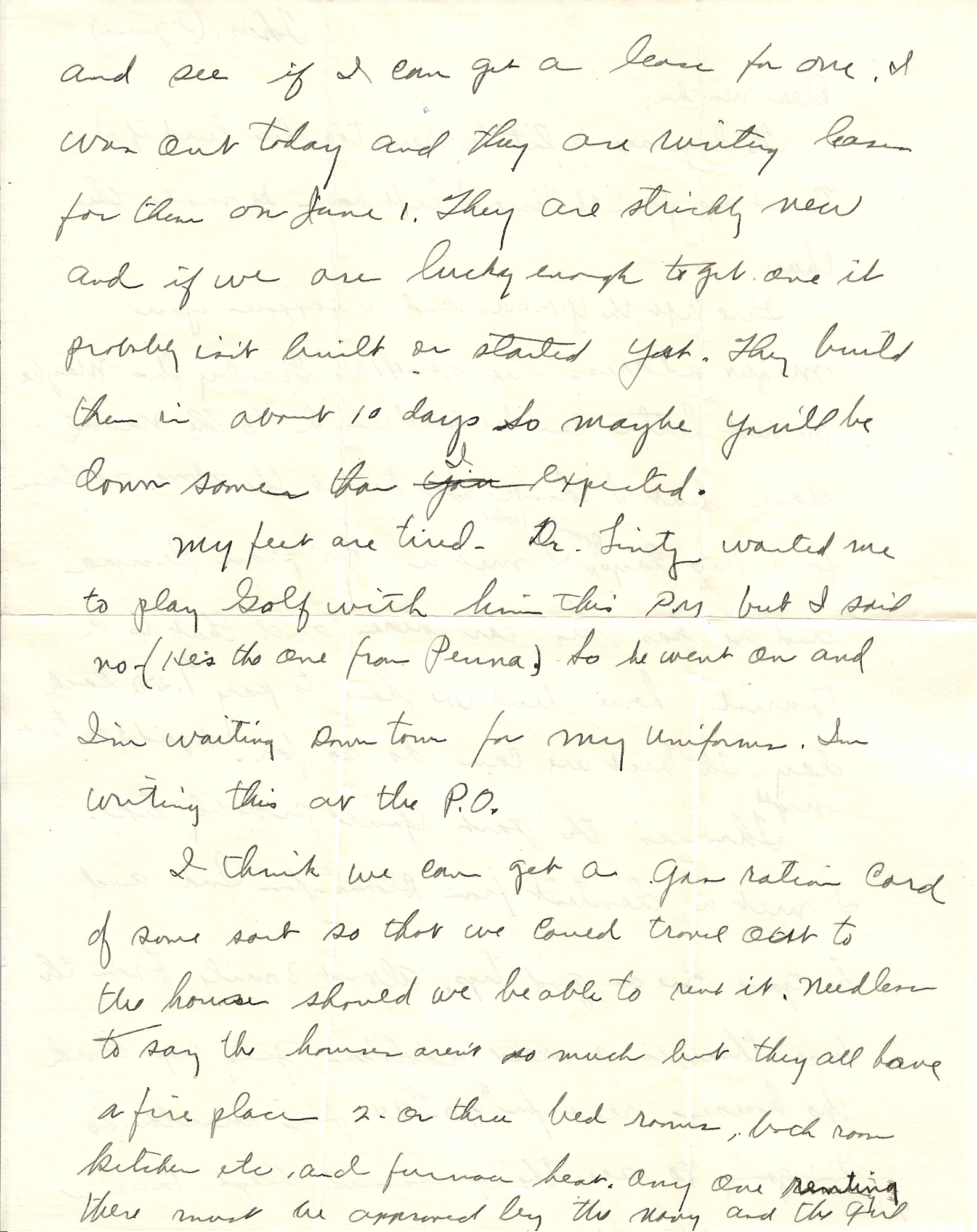 My feet are tired. Dr. Lintz wanted me to play golf with him this PM but I said no-(He’s the one from Penna) so he went on and I’m waiting downtown for my uniforms. I’m writing this at the P.O.