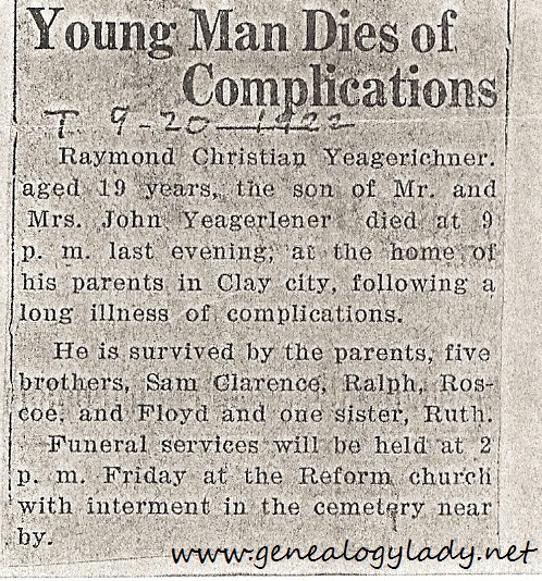 Yegerlehner, Raymond C. – Obituary, 1922 #2 Next → Obituary for Raymond C. Yegerlehner, dated September 20, 1922