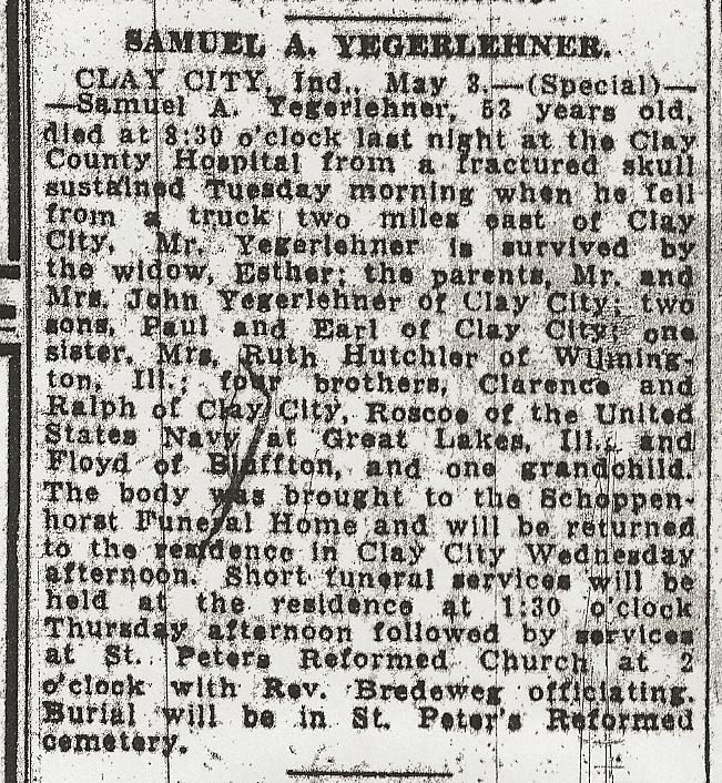 Next → Obituary for Samuel Yegerlehner: Terre Haute Tribune, Wednesday May 3, 1944. p. 2 Terre Haute Tribune; Wednesday, May 3, 1944, p.2