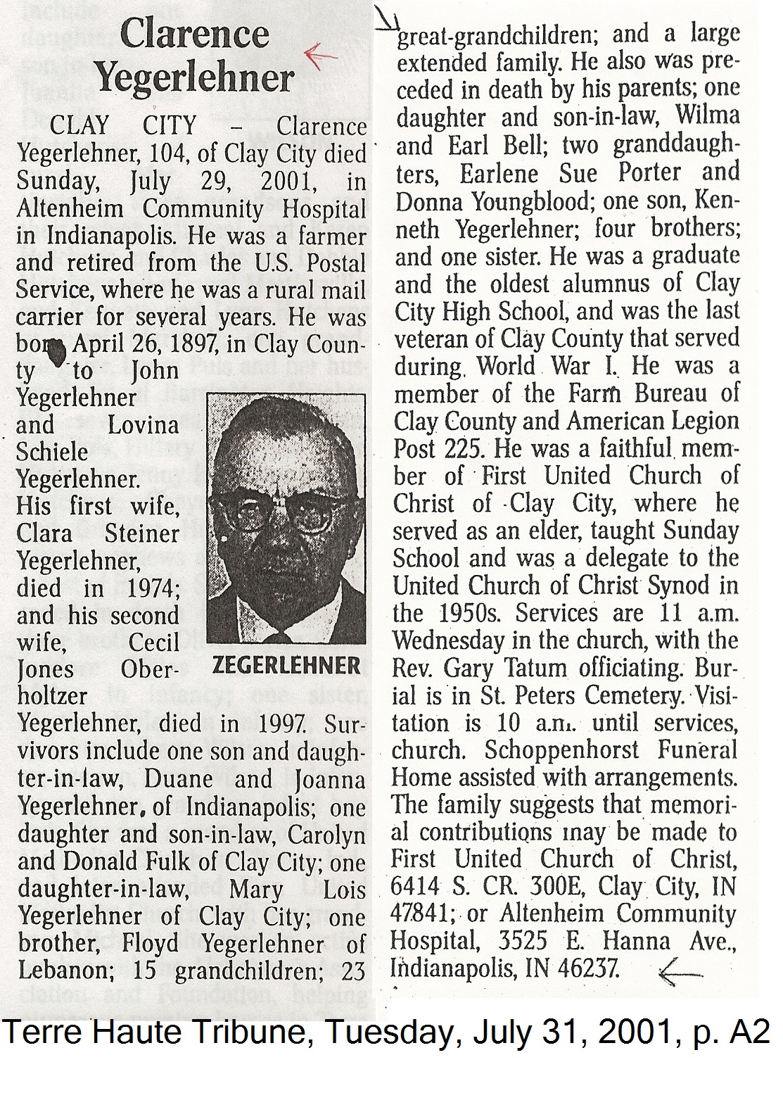 Yegerlehner, Clarence – Obituary, 2001
