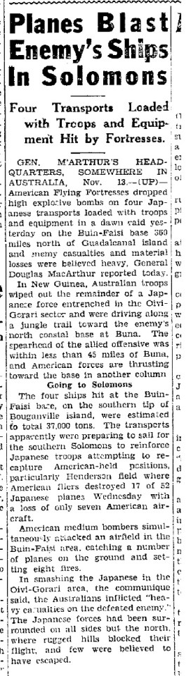 Planes Blast Enemy’s Ships – 1942-11-13 ← Previous Planes Blast Enemy’s Ships (UP – November 13, 1942)