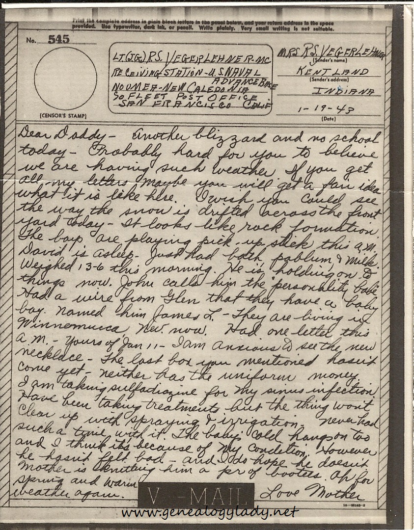 Dear Daddy – Another blizzard and no school today – Probably hard for you to believe we are having such weather. If you get all my letters maybe you will get a fair idea what it is like here. I wish you could see the way the snow is drifted across the front yard today – It looks like rock formation. The boys are playing pick-up stick this A.M. David is asleep. Just had both pablum & milk. Weighted 13-6 this morning. He is holding things now. John calls him the “personality babe” Had a wire from Glen that they have a baby boy named him James L. – They are living in Winnemucca Nev. now. Had one letter this A.M. – Yours of Jan 11 – I am anxious to see the new necklace – The lace box you mentioned hasn’t come yet – Neither has the uniform money. I am taking sulfadiozine for my sinus infection. Have been taking treatments but the thing won’t clear up with spraying & irrigation. Never had such a time with it. The baby’s cold hangs on too and I think it’s because of my condition. However he hasn’t felt bad – and I do hope he doesn’t. Mother is knitting him a pr of bootees. Oh for spring and warm weather again.