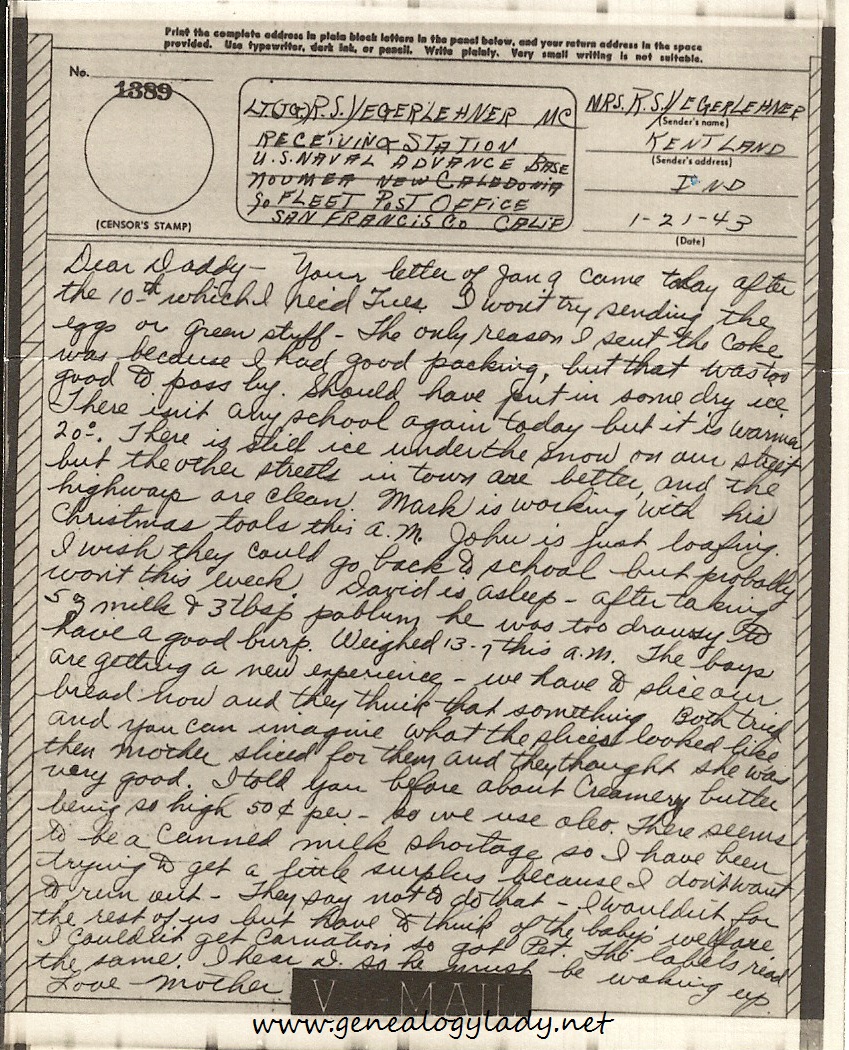 Dear Daddy – Your letter of Jan 9 came today after the 10th – which I rec’d Tues. I won’t try sending the eggs or green stuff. The only reason I sent the coke was because I had good packing, but that was too good to pass by. Should have put in some dry ice. There isn’t any school again today but it is warmer 20°. There is still ice under the snow on our street but the other streets in town are better and the highways are clean. Mark is working with his Christmas tools this A.M. John is just loafing. I wish they could go back to school but probably won’t this week. David is asleep – after taking 5 oz milk & 3 tbsp pablum he was too drowsy to have a good burp. Weighed 13-7 this A.M. The boys are getting a new experience – we have to slice our bread now and they think that something. Both tried and you can imagine what the slices looked like then Mother sliced for them and they thought she was very good. I told you before about creamery butter being so high 50¢ per – so we use oleo. There seems to be a canned milk shortage so I have been trying to get a little surplus because I don’t want to run out. They say not to do that. I wouldn’t for the rest of us but have to think of the baby’s welfare. I couldn’t get carnation so got Pet. The labels read the same. I hear D. so he must be waking up