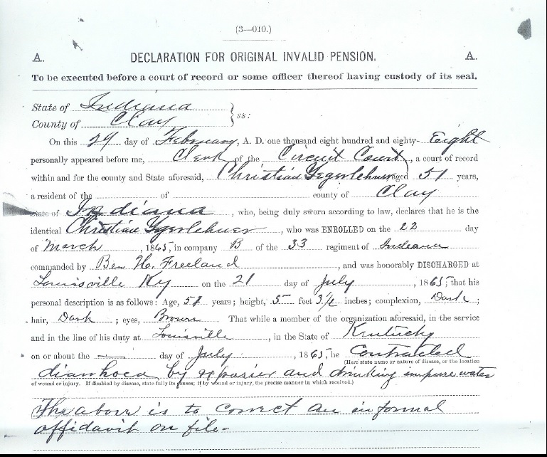 On this 29 day of February, A.D. one thousand eight hundred and eighty-eight personally appeared before me, Clerk of the Circuit Court, a court of record within and for the county and State aforesaid, Christian Yegerlehner, aged 51 years, a resident of the ________of________county of Clay state of Indiana, who being duly sworn according to law, declared that he is the identical Christian Yegerlehner, who was ENROLLED on the 22 day of March, 1865, in company B of the 33 regiment of Indiana commanded by Ben H. Freeland, and was honorably DISCHARGED at Louisville Ky on the 21 day of July, 1865; that his personal description is as follows: Age, 51; height, 5 feet 3 ½ inches; complexion, Dark; hair, Dark; eyes Brown. That while a member of the organization aforesaid, in the service and in the line of his duty at Louisville, in the State of Kentucky on or about the — day of July, 1865, he contracted diarrhea by exposure and drinking impure water.