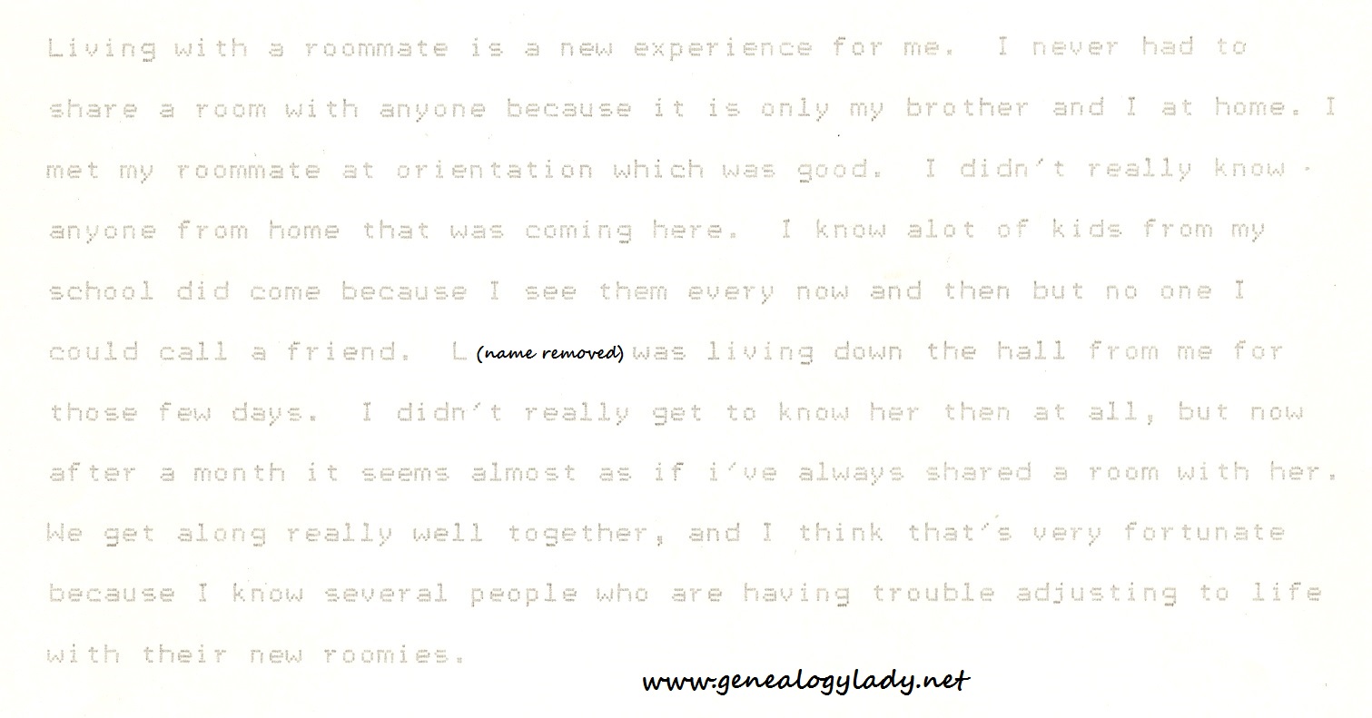 “Living with a roommate is a new experience for me. I never had to share a room with anyone because it is only my brother and I at home. I met my roommate at orientation which was good. I didn’t really know anyone from home that was coming here. I know a lot of kids from my school did come because I see them every now and then but no one I could call a friend. L – – was living down the hall from me for those few days. I didn’t really get to know her then at all, but now after a month it seems almost as if I’ve always shared a room with her. We get along really well together, and I think that’s very fortunate because I know several people who are having trouble adjusting to life with their new roomies.”