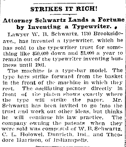 Lawyer W. B. Schwartz, 1130 Brookside ave., has invented a typewriter, which he has sold to the typewriter trust for something like $50,000 down and $3,000 a year to remain out of the typewriter inventing business until 1901.
