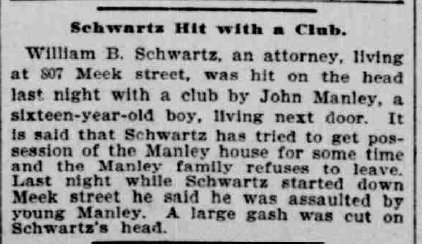 William B. Schwartz, an attorney, living at 807 Meek street, was hit on the head last night with a club by John Manley, a sixteen-year-old boy, living next door. It is said that Schwartz has tried o get possession of the Manley house for some time and the Manley family refuses to leave. Last night while Schwartz started down Meek street he said he was assaulted by young Manley. A large gash was cut on Schwartz’s head.