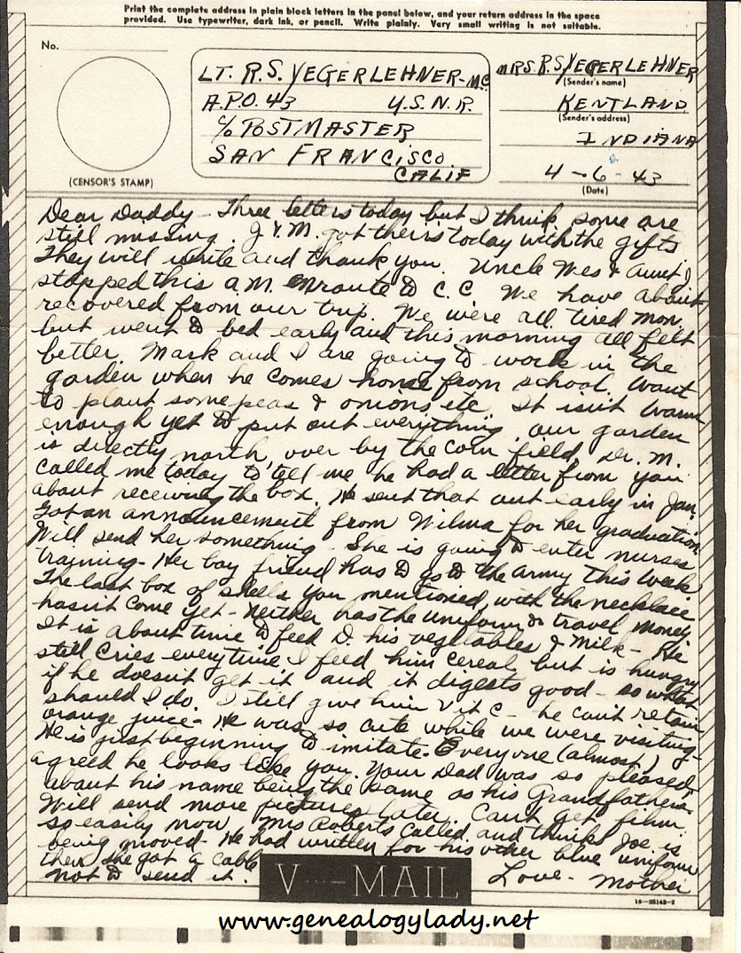 Dear Daddy – Three letters today but I think some are still missing. J. & M. got theirs today with the gifts. They will write and thank you. Uncle Wes & Aunt J. stopped this a.m. enroute to C. C. We have about recovered from our trip. We were all tired Mon. but went to bed early and this morning all felt better. Mark and I are going to work in the garden when he comes home from school. Want to plant some peas & onions etc. It isn’t warm enough yet to put out everything. Our garden is directly north over by the corn field. Dr. M. called me today to tell me he had a letter form you about receiving the box. He sent that out early in Jan. Got an announcement from Wilma for her graduation. Will send her something. She is going to enter nurses training. Her boy friend has to go to the army this week. The last box of shells you mentioned with the necklace hasn’t come yet – Neither has the uniform or travel money. It is about time to feed D. his vegetables & milk. He still cries every time I feed him cereal but is hungry if he doesn’t get it and it digests good – so what should I do. I still give him Vit C – he can’t retain orange juice. He was so cute while we were visiting. He is just beginning to imitate. Everyone (almost) agreed he looks like you. Your Dad was so pleased about his name being the same as his grandfather’s. Will send more pictures later. Can’t get film so easily now. Mrs. Roberts called and thinks Joe is being moved. He had written for his other blue uniform then she got a cable not to send it.