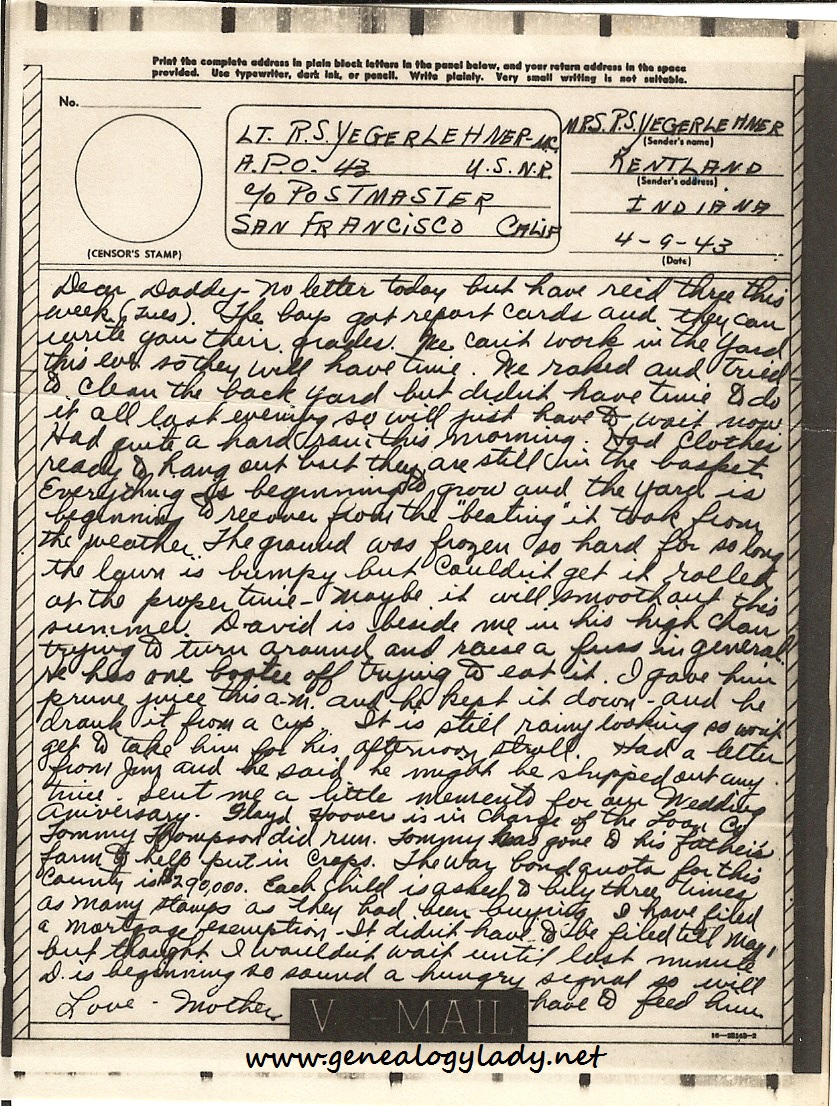 Dear Daddy – No letter today but have rec’d three this week (Tues). The boys got report cards and they can write you their grades. We can’t work in the yard this eve so they will have time. We raked and tried to clean the back yard but didn’t have time to do it all last evening so will just have to wait now. Had quite a hard rain this morning. Had clothes ready to hang out but they are still in the basket. Everything is beginning to grow and the yard it beginning to recover from the “beating” it took from the weather. The ground was frozen so hard for so long the lawn is bumpy but couldn’t get it tolled at the proper time – Maybe it will smooth out this summer. David is beside me in his high chair trying to turn around and raise a fuss in general. He has one bootee off trying to eat it. I gave him prune juice this a.m. and he kept it down – and he drank it from a cup. It is still rainy looking so won’t get to take him for his afternoon stroll. Had a letter from Jim and he said he might be shipped out any time. Sent me a little memento for our Wedding Anniversary – Floyd Hoover is in charge of the Loan Co. Tommy Thompson did run. Tommy has gone to his father’s farm to help put in crops. The war bond quota for this county is $290,000. Each child is asked to buy three times as many stamps as they had been buying. I have filed a mortgage exemption. It didn’t have to be filed till May 1 but I thought I wouldn’t wait until last minute. D. is beginning to sound a hungry signal so will have to feed him.