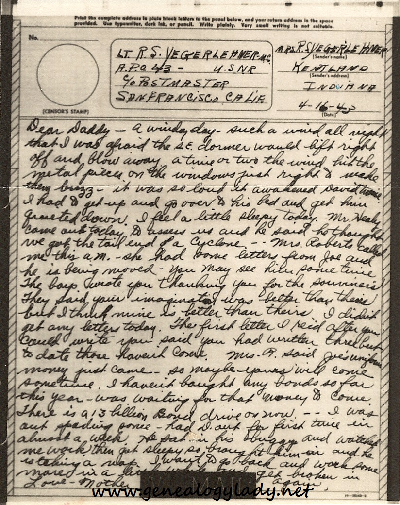 Dear Daddy – A windy day – such a wind all night that I was afraid the S. E. dormer would lift right off and blow away, a time or two the wind hit the metal pieces of the windows just right to make them buzz – it was so loud it awakened David twice. I had to get up and go over to his bed and get him quieted down. I feel a little sleepy today. Mr. Healy came out today to assess us and he said he thought we got the tail end of a cyclone – – Mrs. Roberts called me this a.m. – she had some letters from Joe and he is being moved – you may see him some time. The boys wrote you thanking you for the souvenirs. They said your imagination was better than theirs but I think mine is better than theirs. I didn’t get any letters today. The first letter I rec’d after you could write you said you had written three but to date those haven’t come. Mrs. R. said Joe’s uniform money just came – so maybe yours will come sometime. I haven’t bought any bonds so far this year – was waiting for that money to come. There is a 13 billion Bond drive on now – – I was out spading some – had D. out for first time in almost a week. He sat in his buggy and watched me work then got sleepy so brought him in and he is taking a nap. I want to go back and work some more in a little while and get broken in again.