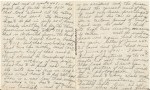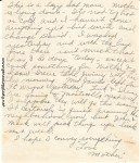 [page 8] This is a lazy Sat. morn. Mother is lying down – It’s not too hot or cold and I haven’t done anything yet but write and change David. I washed yesterday and with the boys gone there isn’t much that has to be done today – except cook something for Mother & I. I saw Irene take Jimmy with her this morning. Mrs. James left for Ft. Wayne yesterday. Link & Irene are going to Monticello next week – I suppose they will go this evening. It certainly is quiet around the neighborhood now, but John & Mark will pick thinks up a little next week.