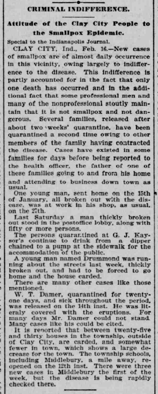 CLAY CITY, Ind., Feb. 16. – New cases of smallpox are of almost daily occurrence in this vicinity, owing largely to indifference to the disease. This indifference is partly accounted for in the fact that only one death has occurred and in the additional fact that some professional men and many of the nonprofessional stoutly maintain that it is not smallpox and not dangerous. Several family, released after about two weeks’ quarantine, have been quarantined a second time owing to other members of the family having contracted the disease. Cases have existed in some families for days before being reported to the health officer, the father of one of these families going to and from his home and attending to business down town as usual.