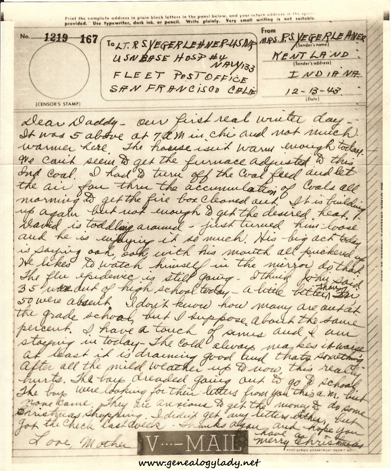 Dear Daddy – Our first real winter day – It was 5 above at 7 a.m. in Chi. and not much warmer here. The house isn’t warm enough today. We can’t seem to get the furnace adjusted to this Ind. coal. I had to turn off the coal feed and let the air fan thru the accumulation of coals all morning to get the fire box cleaned out. It is building up again but not enough to get the desired heat. David is toddling around – just turned him loose and he is enjoying it so much. His big act today is saying ooh, ooh, with his mouth all puckered up. He likes to watch himself in the mirror do that. The flu epidemic is still going – I think John said 35 were out of high school today – a little better than Fri., 50 were absent. I don’t know how many are out at the grade school, but I suppose about the same percent. I have a touch of sinus and I am staying in today – The cold always makes it worse. At least it is draining good and that’s something. After all the mild weather up to now this really hurts. The boys dreaded going out to go to school They boys were looking for their letters from you this a.m. but none came. They are anxious to get the money to do some Christmas shopping. I didn’t get any letters either, but got the check last week – thanks again and hope you have a Merry Christmas