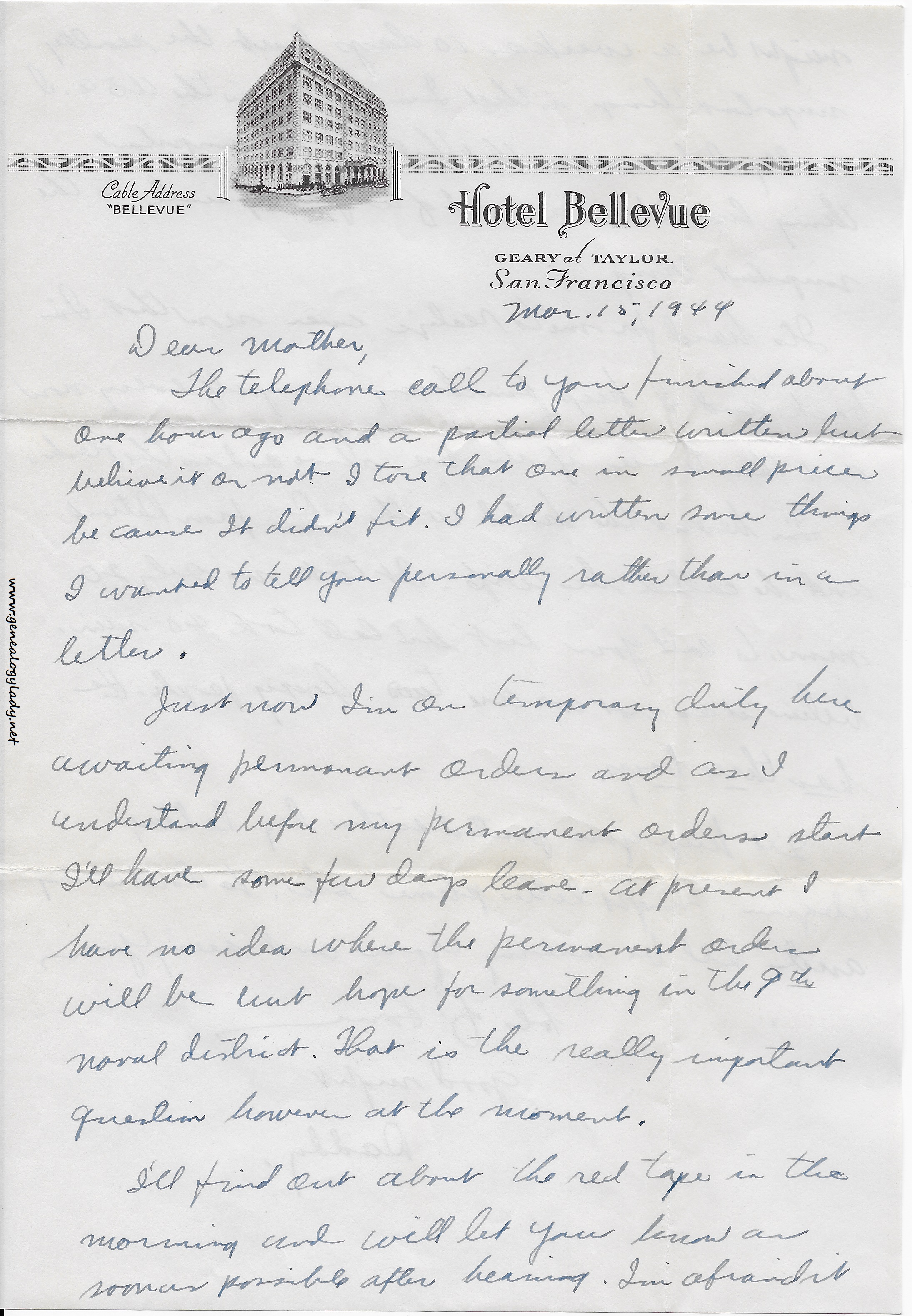 Just now I’m on temporary duty here awaiting permanent orders and as I understand before my permanent orders start I’ll have some few days leave – at present I have no idea where the permanent orders will be but hope for something in the 9th Naval district. That is the really important question however at the moment.