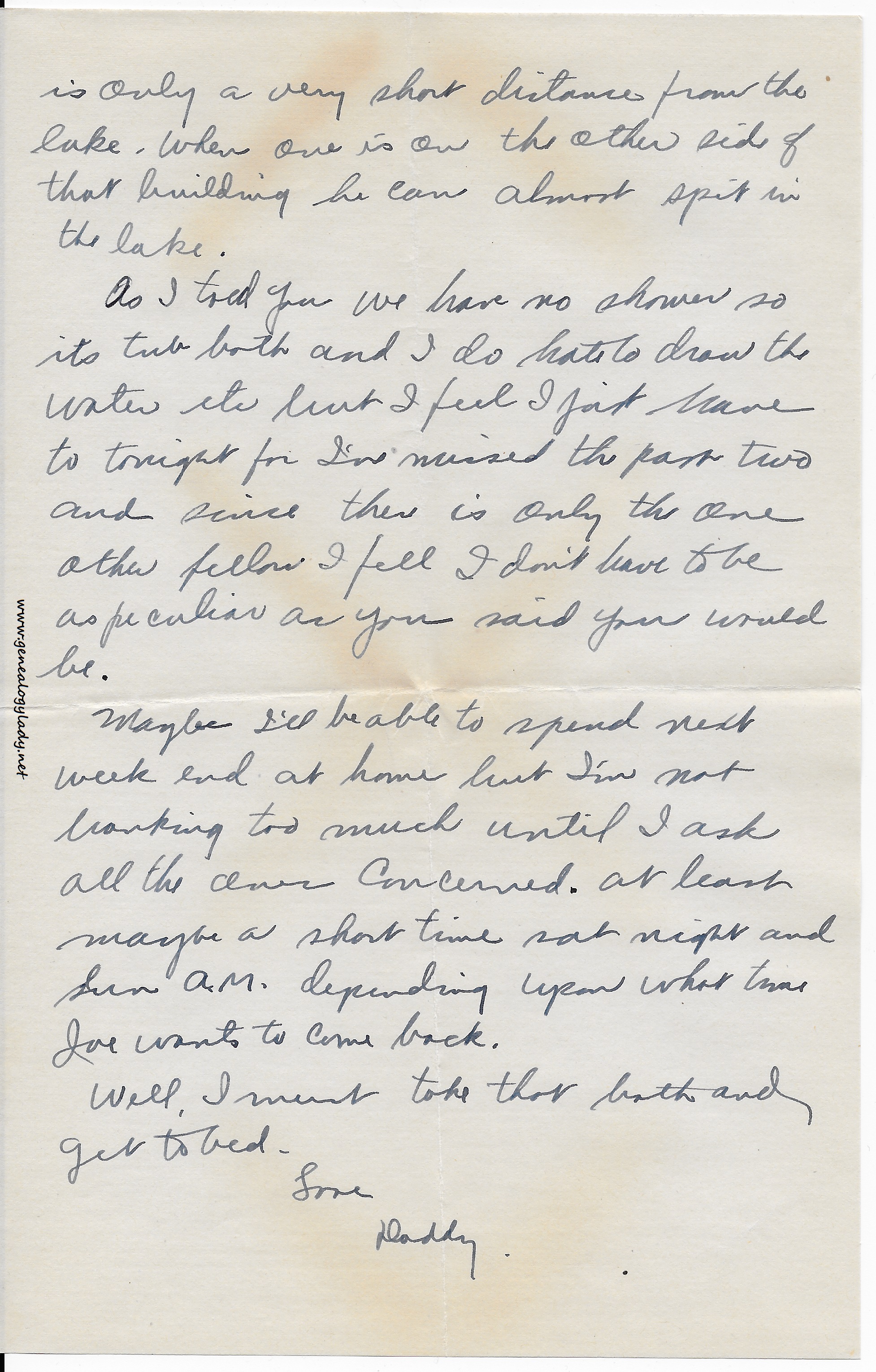 As I told you we have no shower so it’s tub bath and I do hate to draw the water, etc., but I feel I just have to tonight for I’ve missed the past two and since there is only the one other fellow I feel I don’t have to be as peculiar as you said you would be.