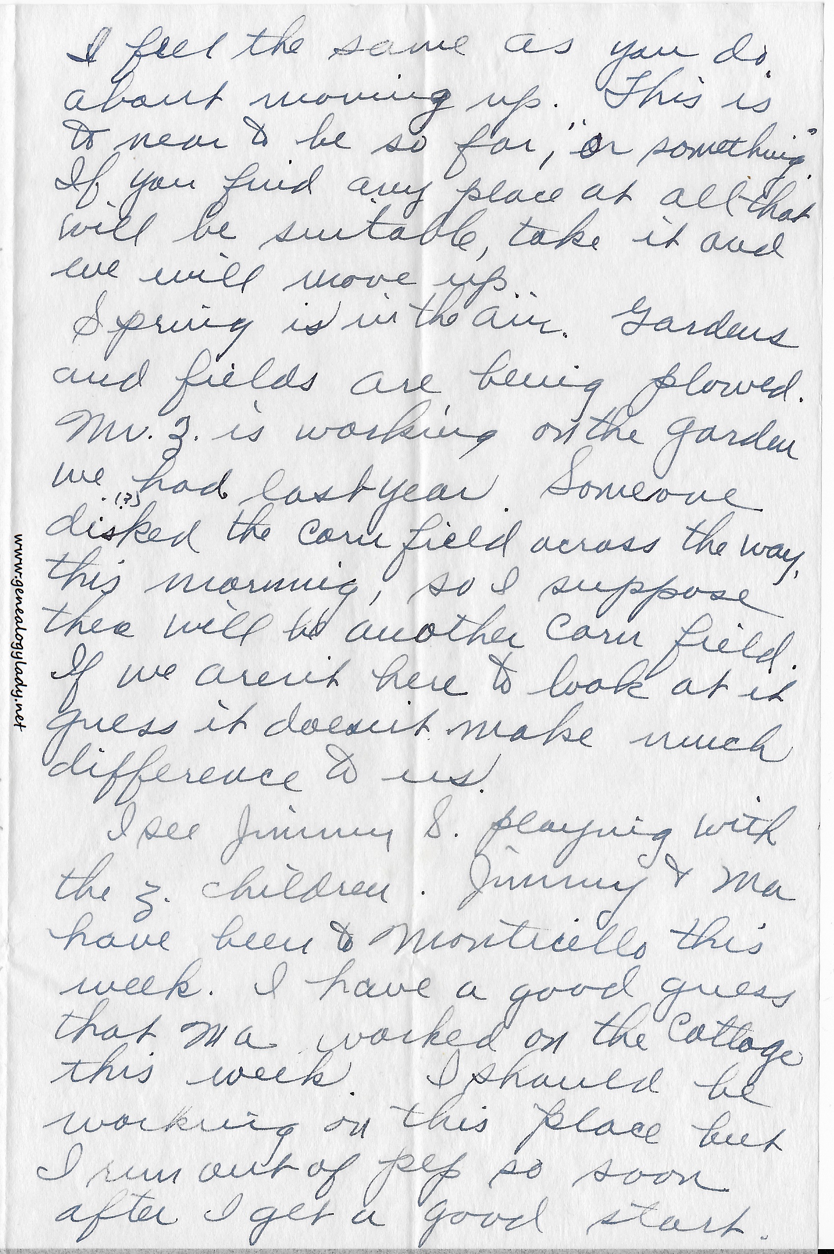 Spring is in the air. Gardens and fields are being plowed. Mr. Z. is working on the garden we had last year. Someone disked (?) the corn field across the way, this morning, so I suppose there will be another corn field. If we aren’t here to look at it guess it doesn’t make much difference to us.
