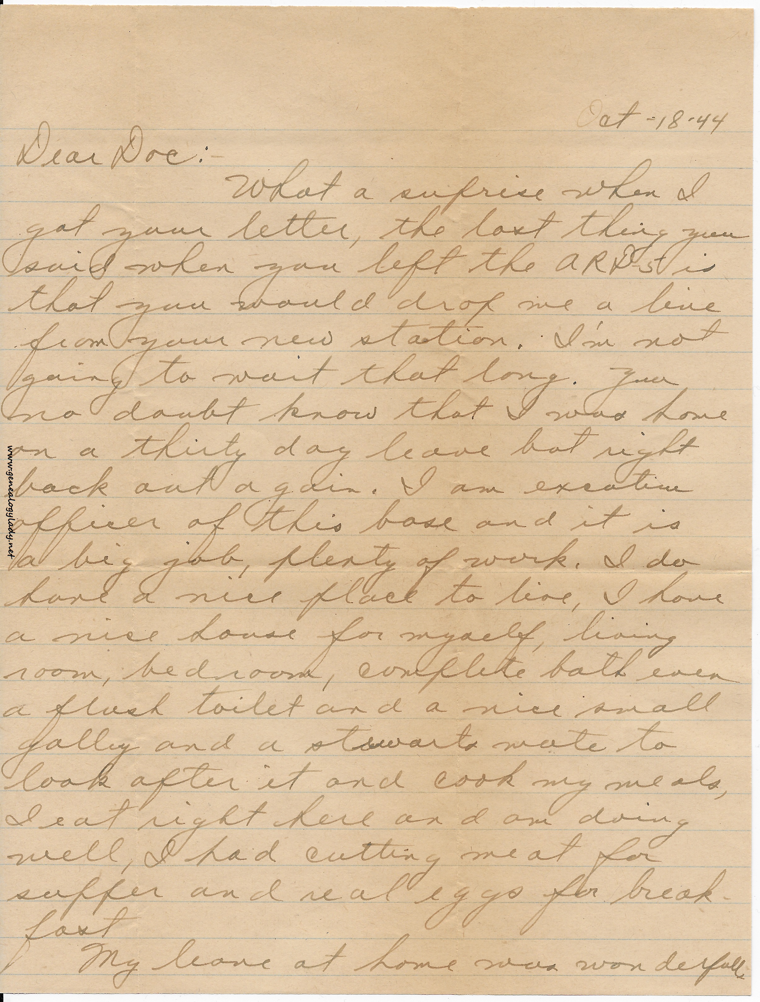 What a surprise when I got your letter, the last thing you said when you left the ARD-5 is that you would drop me a line from your new station. I’m not going to wait that long. You no doubt know that I was home on a thirty day leave but right back out again. I am executive officer of this base and it is a big job, plenty of work. I do have a nice place to live, I have a nice house for myself, living room, bedroom, complete bath even a flush toilet and a nice small galley and a stewart’s mate to look after it and cook my meals, I eat right here and am going well, I had cutting meat for supper and real eggs for breakfast.