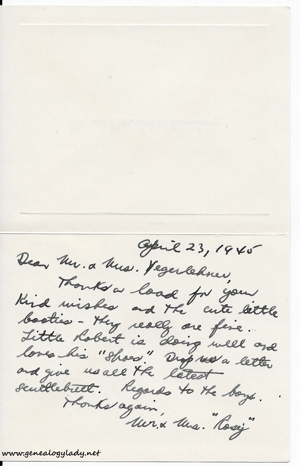 Thanks a load for your kind wishes and the cute little booties – they really are fine. Little Robert is doing well and loves his “shoes.” Drop us a letter and give us all the latest scuttlebutt. Regards to the boys.
