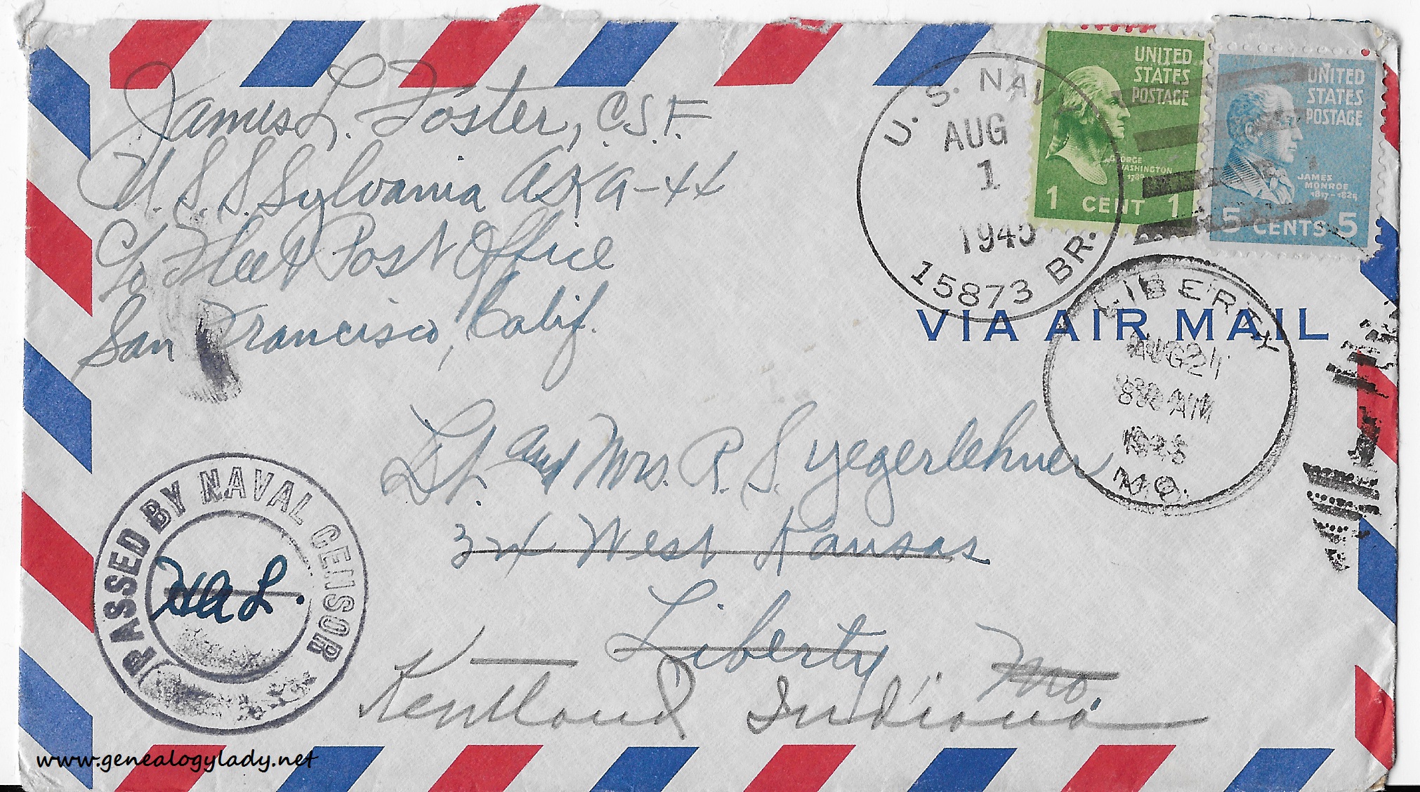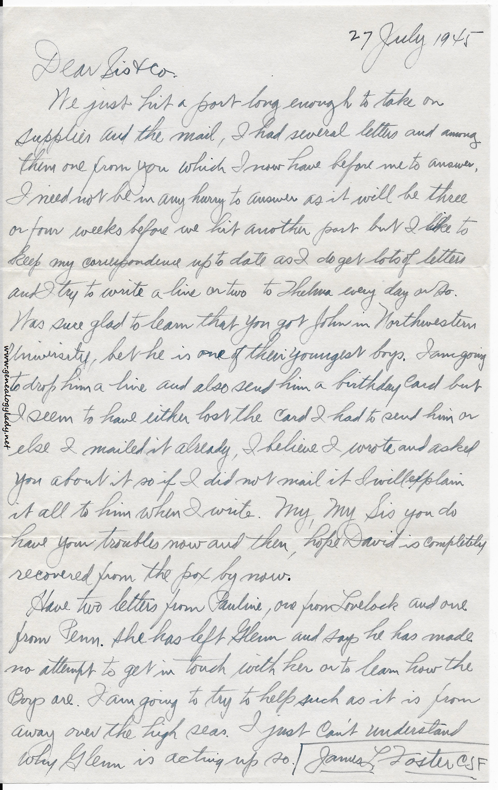 Have two letters from Pauline, one from Lovelock and one from Penn. She has left Glenn and says he has made no attempt to get in touch with her or to learn how the boys are. I am going to try to help such as it is from away over the high seas. I just can’t understand why Glenn is acting up so. (James L. Foster CSF)