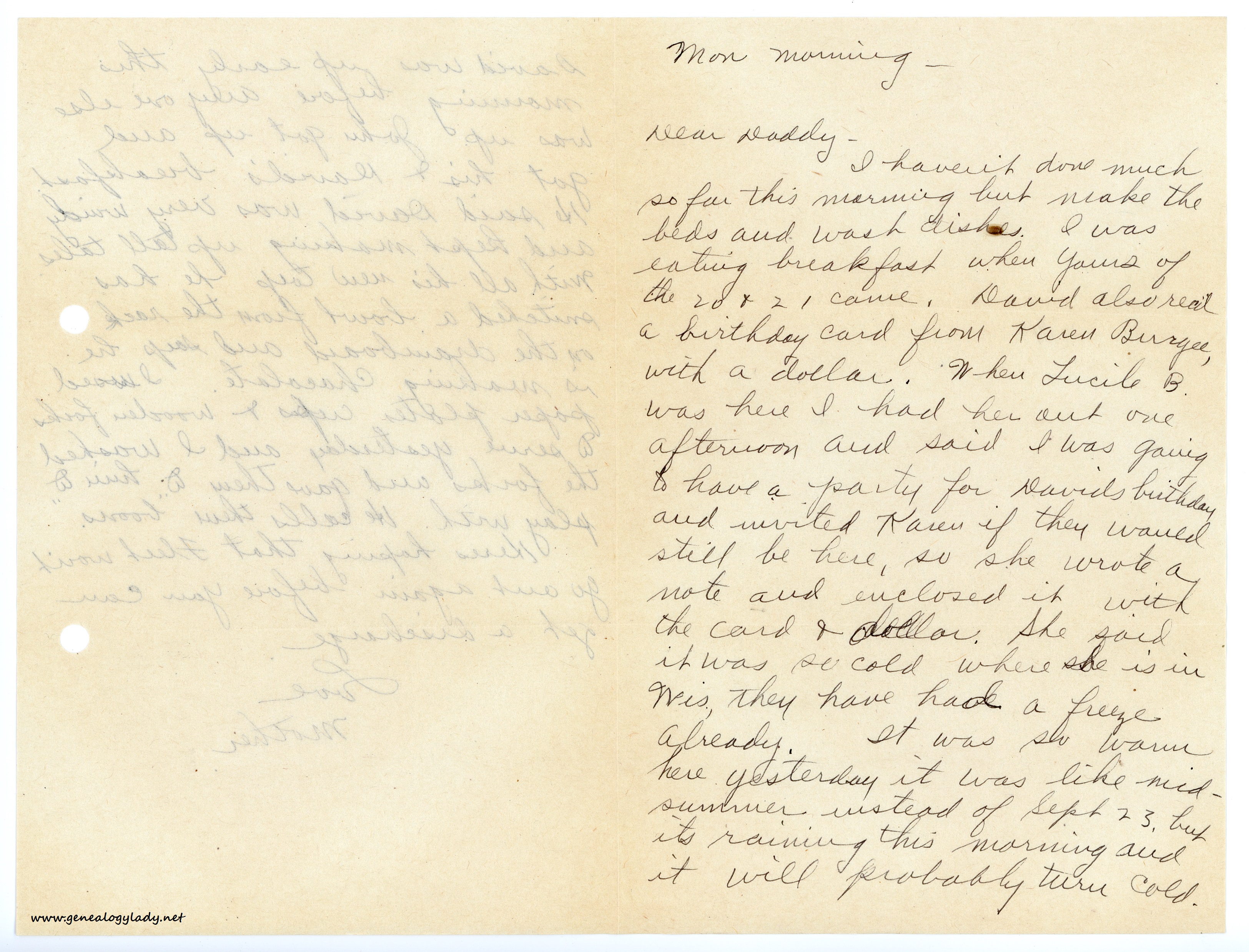 I haven’t done much so far this morning but make the beds and wash dishes. I was eating breakfast when yours of the 20 & 21 came. David also rec’d a birthday card from Karen Burgee, with a dollar. When Lucile B. was here I had her out one afternoon and said I was going to have a party for David’s birthday and invited Karen if they would still be here, so she wrote a note and enclosed it with the card & dollar. She said it was so cold where she is in Wis., they have had a freeze already. It was so warm here yesterday it was like mid-summer instead of Sept. 23, but it’s raining this morning and it will probably turn cold.