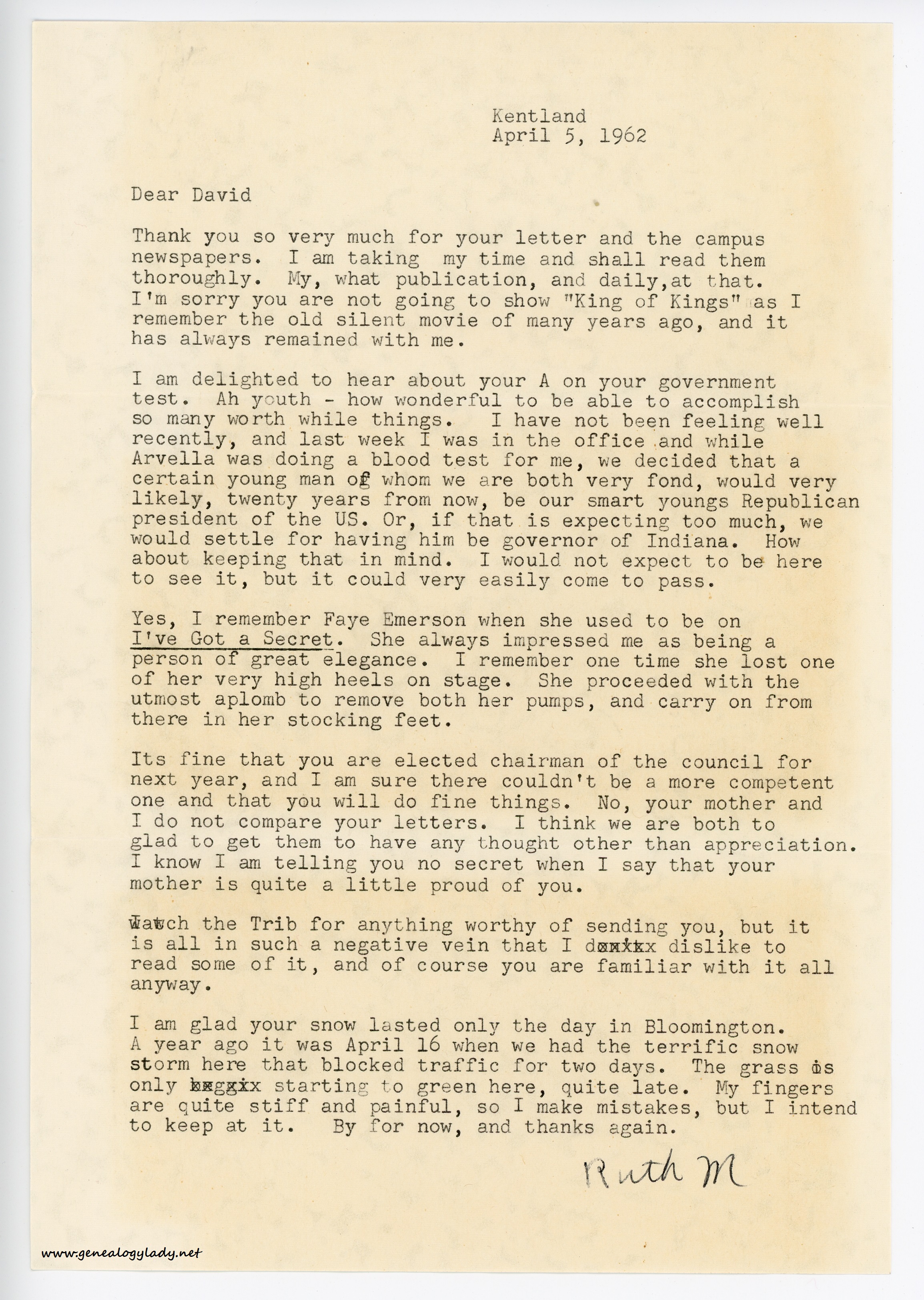 I am delighted to hear about you’re a on your government test. Ah youth – how wonderful to be able to accomplish so many worthwhile things. I have not been feeling well recently, and last week I was in the office and while Arvella was doing a blood test for me, we decided that a certain young man of whom we are both very fond, would very likely, twenty years from now, be our smart young Republican present of the U.S. Or, if that is expecting too much, we would settle for having him be governor of Indiana. How about keeping that in mind. I would not expect to be here to see it, but it could very easily come to pass.