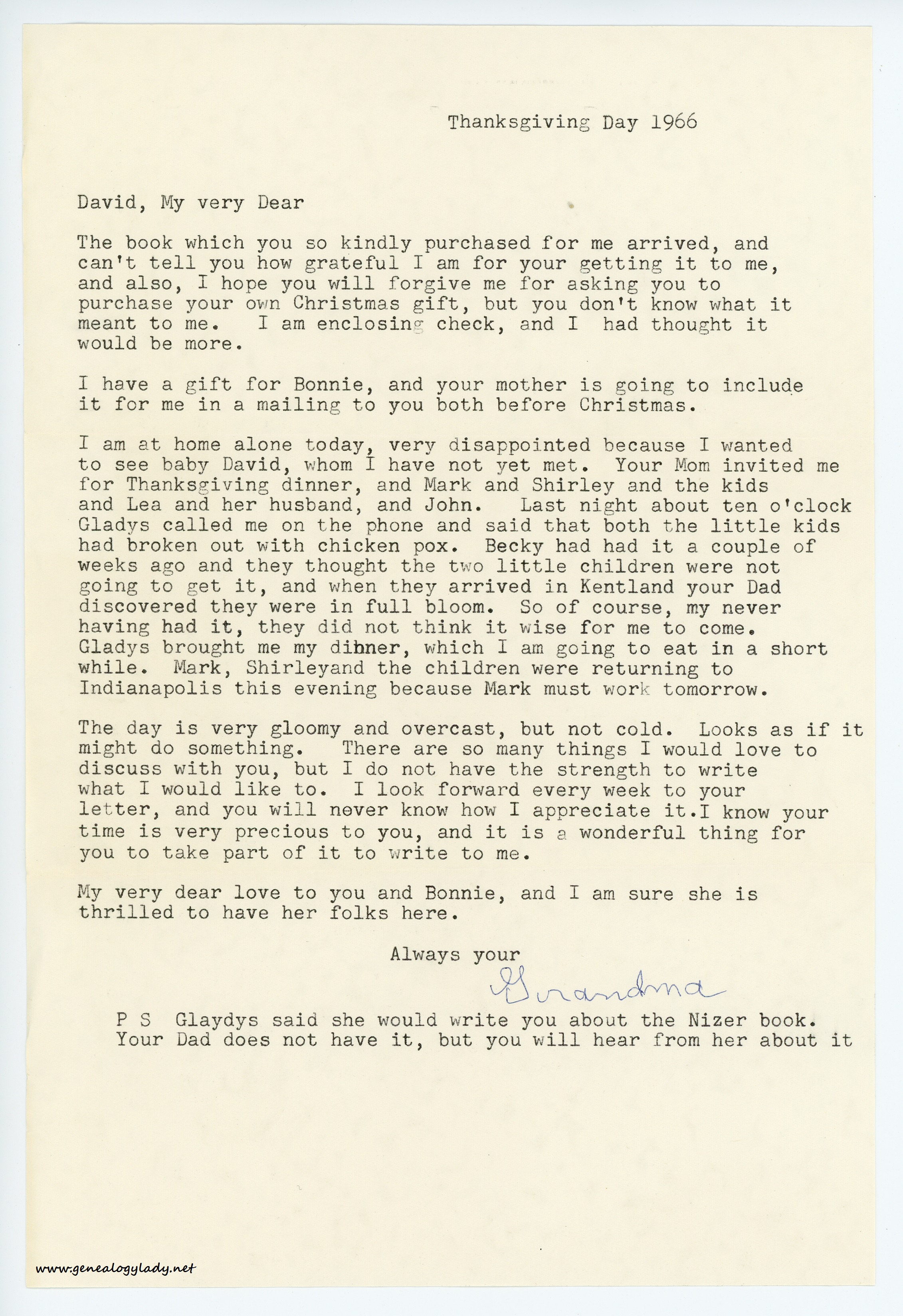 I am at home alone today, very disappointed because I wanted to see baby David, whom I have not yet met. Your Mom invited me for Thanksgiving dinner, and Mark and Shirley and the kids and Lea and her husband, and John. Last night about ten o’clock Gladys called me on the phone and said that both the little kids had broken out with chicken pox. Becky had had it a couple of weeks ago and they thought the two little children were not going to get it, and when they arrived in Kentland your Dad discovered they were in full bloom. So of course, my never having had it, they did not think it wise for me to come. Gladys brought me my dinner, which I am going to eat in a short while. Mark, Shirley and the children were returning to Indianapolis this evening because Mark must work tomorrow.