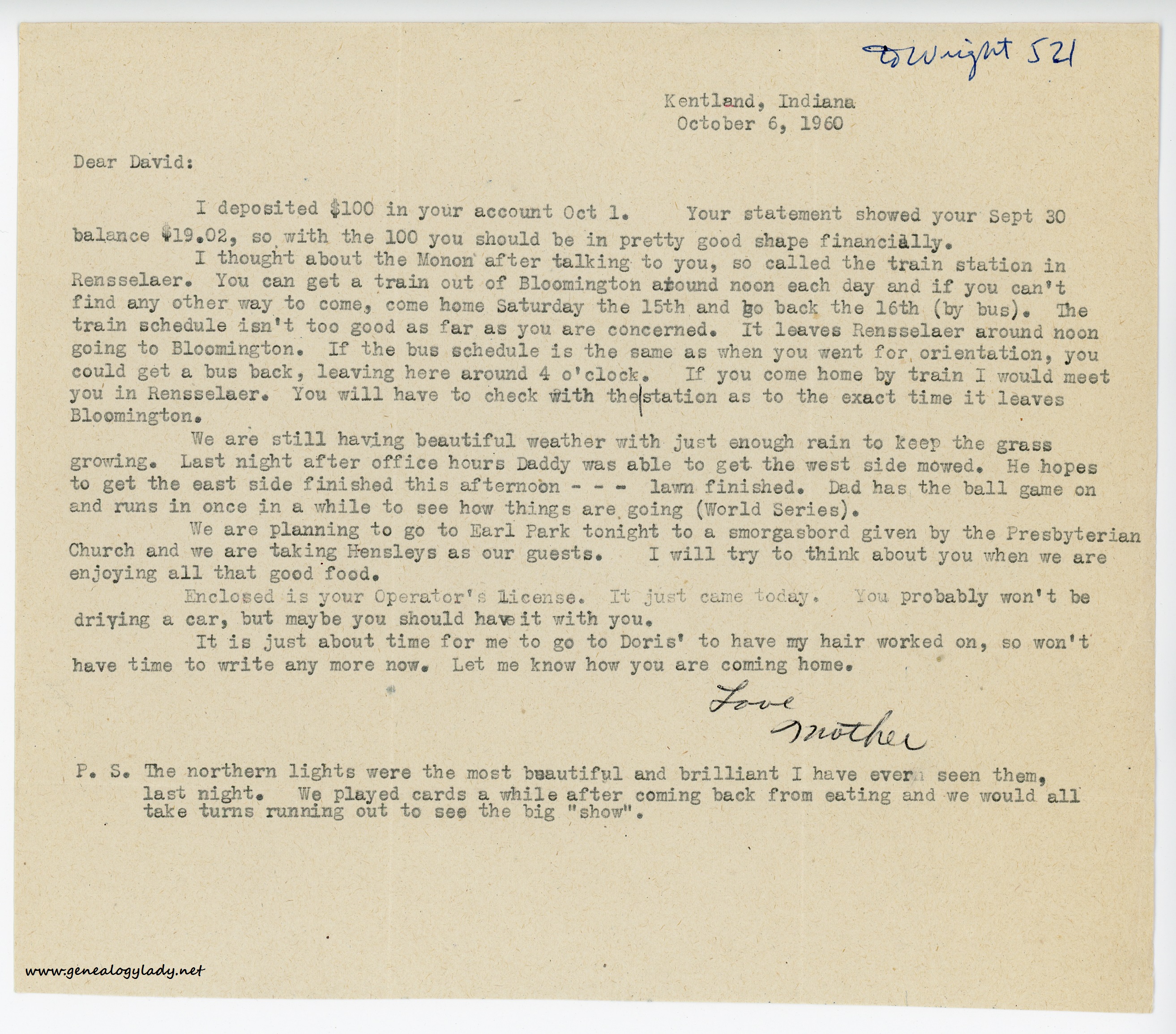 I thought about the Monon after talking to you, so called the train station in Rensselaer. You can get a train out of Bloomington around noon each day and if you can’t find any other way to come, come home Saturday the 15th and go back the 16th (by bus). The train schedule isn’t too good as far as you are concerned. It leaves Rensselaer around noon going to Bloomington. If the bus schedule is the same as when you went for orientation, you could get a bus back, leaving here around 4 o’clock. If you come home by train I would meet you in Rensselaer. You will have check with the station as to the exact time it leaves Bloomington.