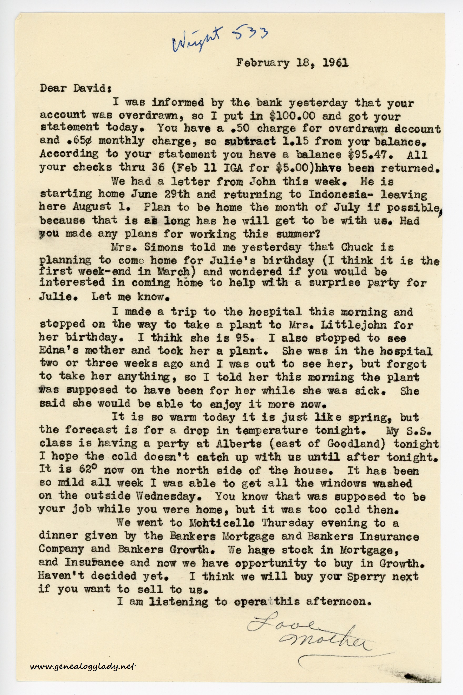 Mrs. Simons told me yesterday that Chuck is planning to come home for Julie’s birthday (I think it is the first week-end in March) and wondered if you would be interested in coming home to help with a surprise party for Julie. Let me know.