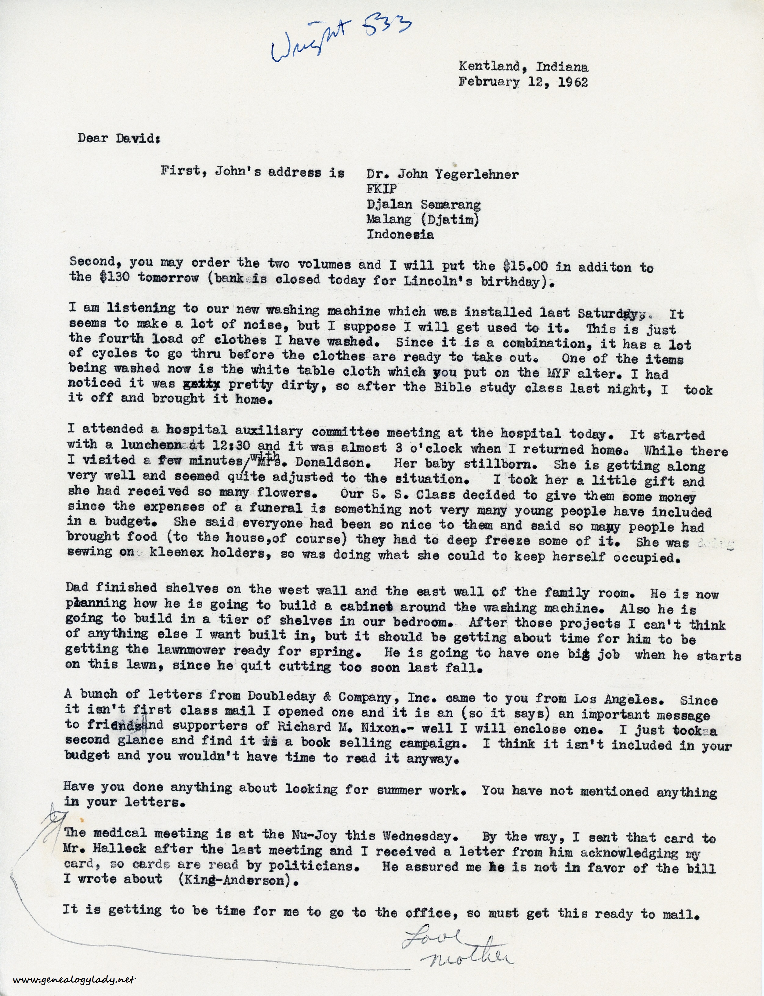 A bunch of letters from Doubleday & Company, inc. came to you from Los Angeles. Since it isn’t first class mail I opened one and it is an (so it says) an important message to friends and supporters of Richard M. Nixon. – well I will enclose one. I just took a second glance and find it is a book selling campaign. I think it isn’t included in your budget and you wouldn’t have time to read it anyway.
