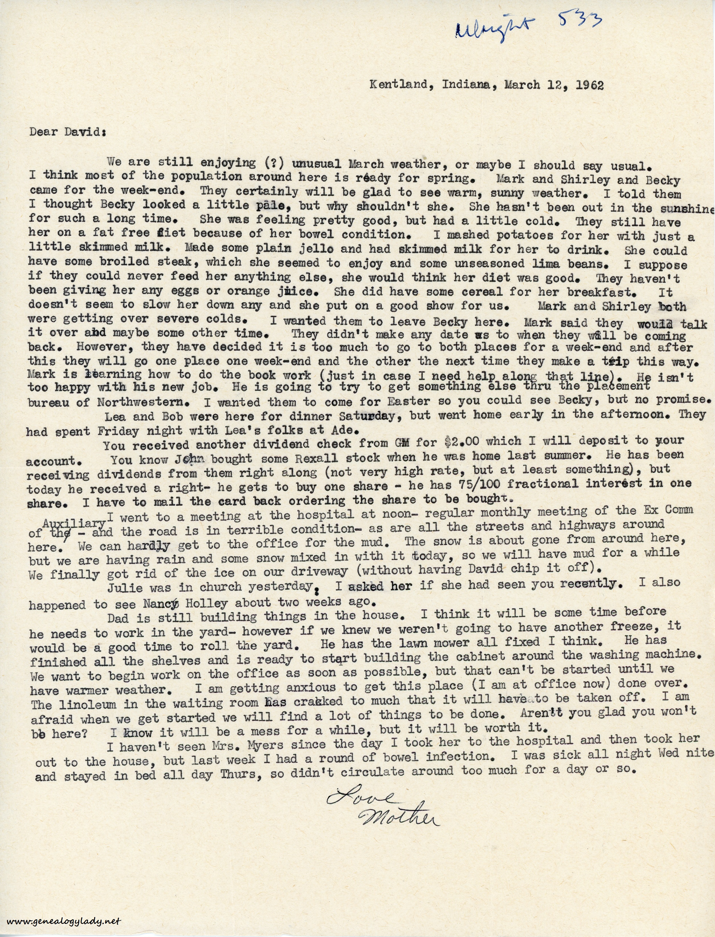 We are still enjoying (?) unusual March weather, or maybe I should say usual. I think most of the population around here is ready for spring. Mark and Shirley and Becky came for the week-end. They certainly will be glad to see warm, sunny weather. I told them I thought Becky looked a little pale, but why shouldn’t she. She hasn’t been out in the sunshine for such a long time. She was feeling pretty good, but had a little cold. They still have her on a fat free diet because of her bowel condition. I mashed potatoes for her with just a little skimmed milk. Made some plain Jello and had skimmed milk for her to drink. She could have some broiled steak, which she seemed to enjoy and some unseasoned lima beans. I suppose if they could never feed her anything else, she would think her diet was good. They haven’t been giving her any eggs or orange juice. She did have some cereal for her breakfast. It doesn’t seem to slow her down any and she put on a good show for us. Mark and Shirley both were getting over severe colds. I wanted them to leave Becky here. Mark said they would talk it over and maybe some other time. They didn’t make any date as to when they will be coming back. However, they have decided it is too much to go to both places for a week-end and after this they will go one place one week-end and the other the next time they make a trip this way. Mark is learning how to do the book work (Just in case I need help along that line). He isn’t too happy with his new job. He is going to try to get something else thru the placement bureau of Northwestern. I wanted them to come for Easter so you could see Becky, but no promise.