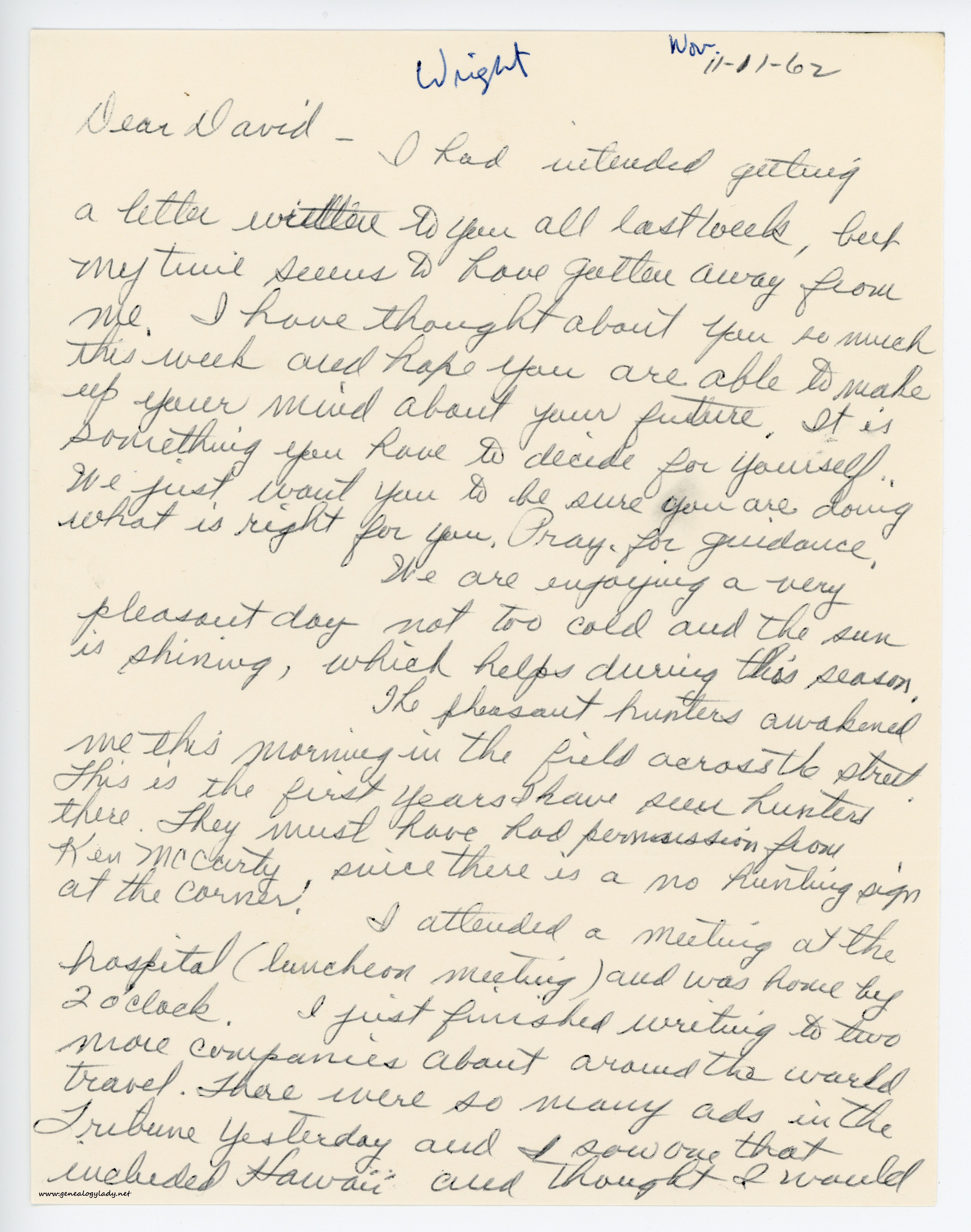I had intended getting a letter written to you all last week, but my time seems to have gotten away from me. I have thought about you so much this week and hope you are able to make up your mind about your future. It is something you have to decide for yourself. We just want you to be sure you are going what is right for you. Pray for guidance.
