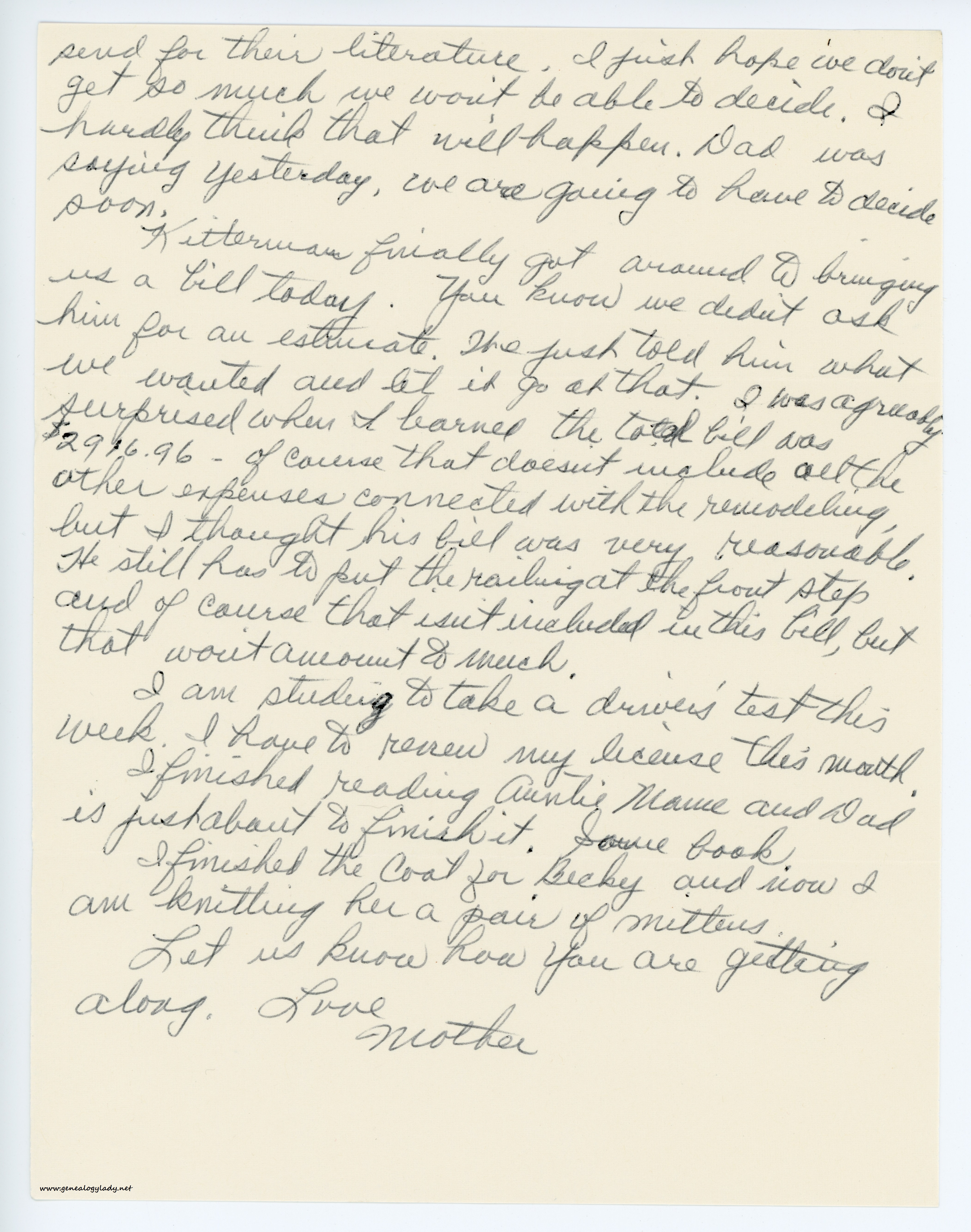 [page 2] send for their literature. I just hope we don’t get so much we won’t be able to decide. I hardly think that will happen. Dad was saying yesterday we are going to have to decide soon.