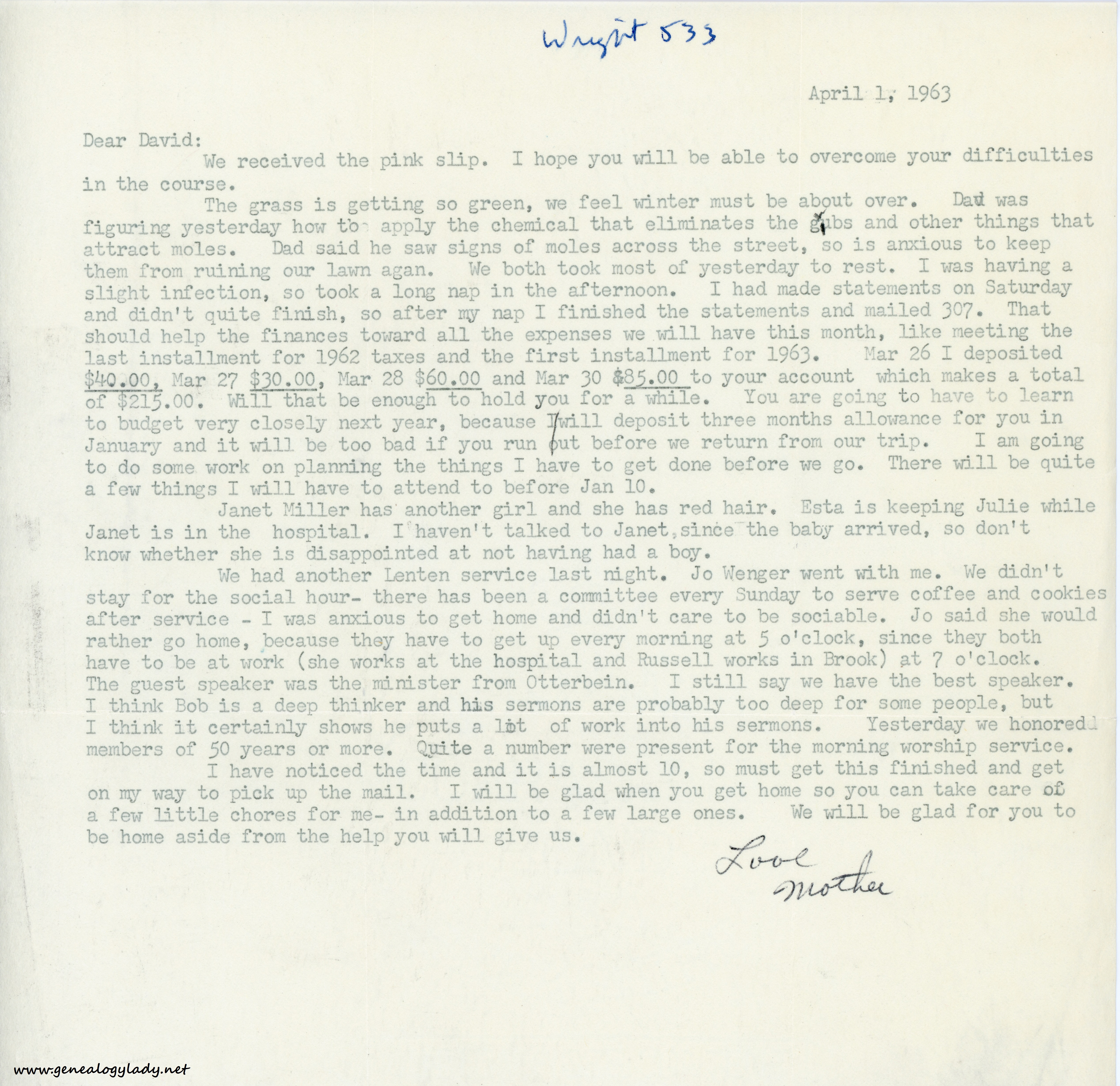 The grass is getting so green, we feel winter must be about over. Dad was figuring yesterday how to apply the chemical that eliminates the grubs and other things that attract moles. Dad said he saw signs of moles across the street, so is anxious to keep them from ruining our lawn again. We both took most of yesterday to rest. I was having a slight infection, so took a long nap in the afternoon. I had made statements on Saturday and didn’t quite finish, so after my nap I finished the statements and mailed 307. That should help the finances toward all the expenses we will have this month, like meeting the last installment for 1962 taxes and the first installment for 1963. March 26 I deposited $40.00, March 27 $30.00, March 28 $60.00, and March 30 $85.00 to your account which makes a total of $215.00. Will that be enough to hold you for a while? You are going to have to learn to budget very closely next year, because I will deposit three months allowance for you in January and it will be too bad if you run out before we return from our trip. I am going to do some work on planning the things I have to get done before we go. There will be quite a few things I will have to attend to before January 10.