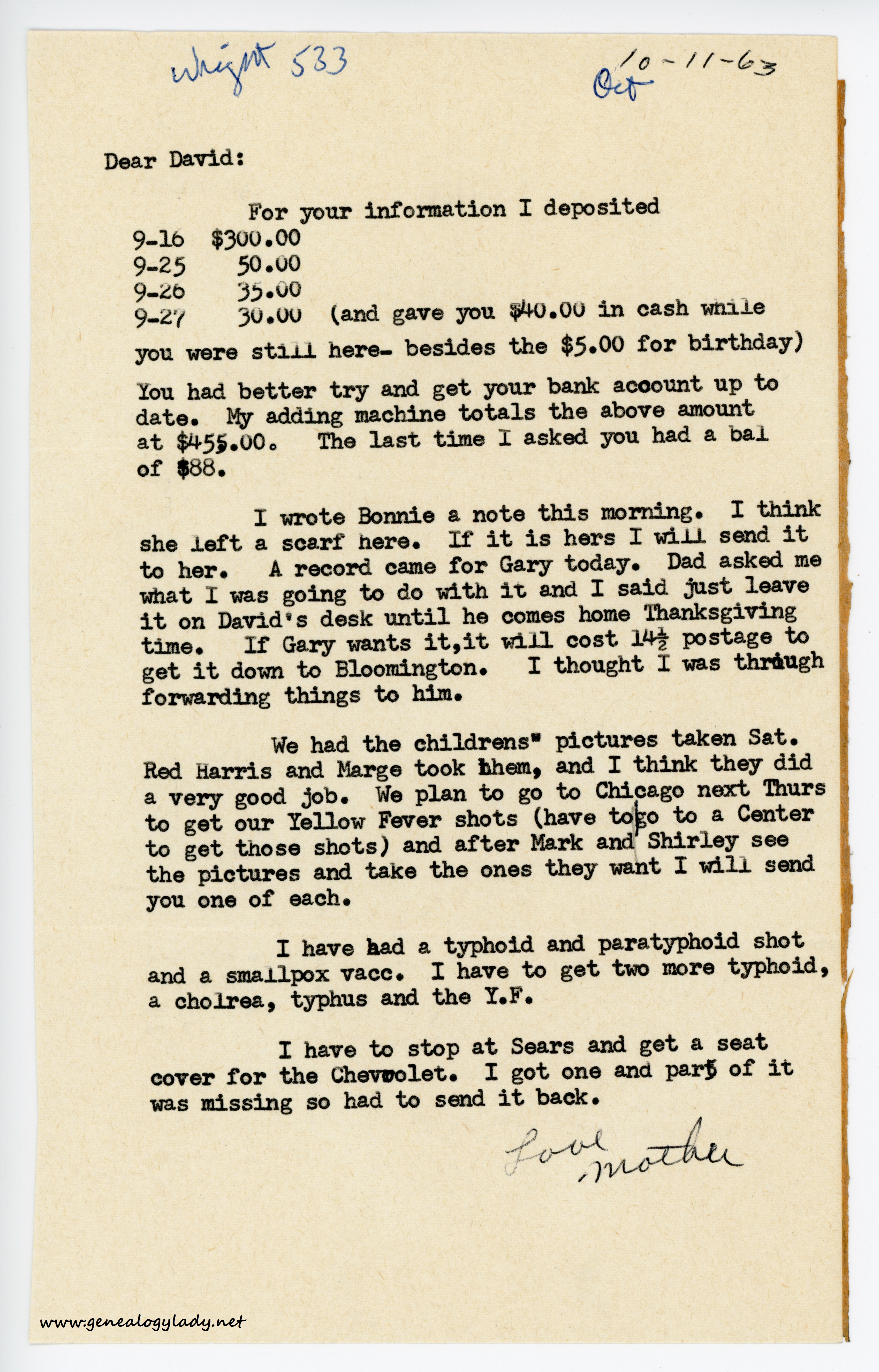 We had the childrens’ pictures taken Saturday. Red Harris and Marge took them, and I think they did a very good job. We plan to go to Chicago next Thursday to get our Yellow Fever shots (have to go to a Center to get those shots) and after Mark and Shirley see the pictures and take the ones they want I will send you one of each.