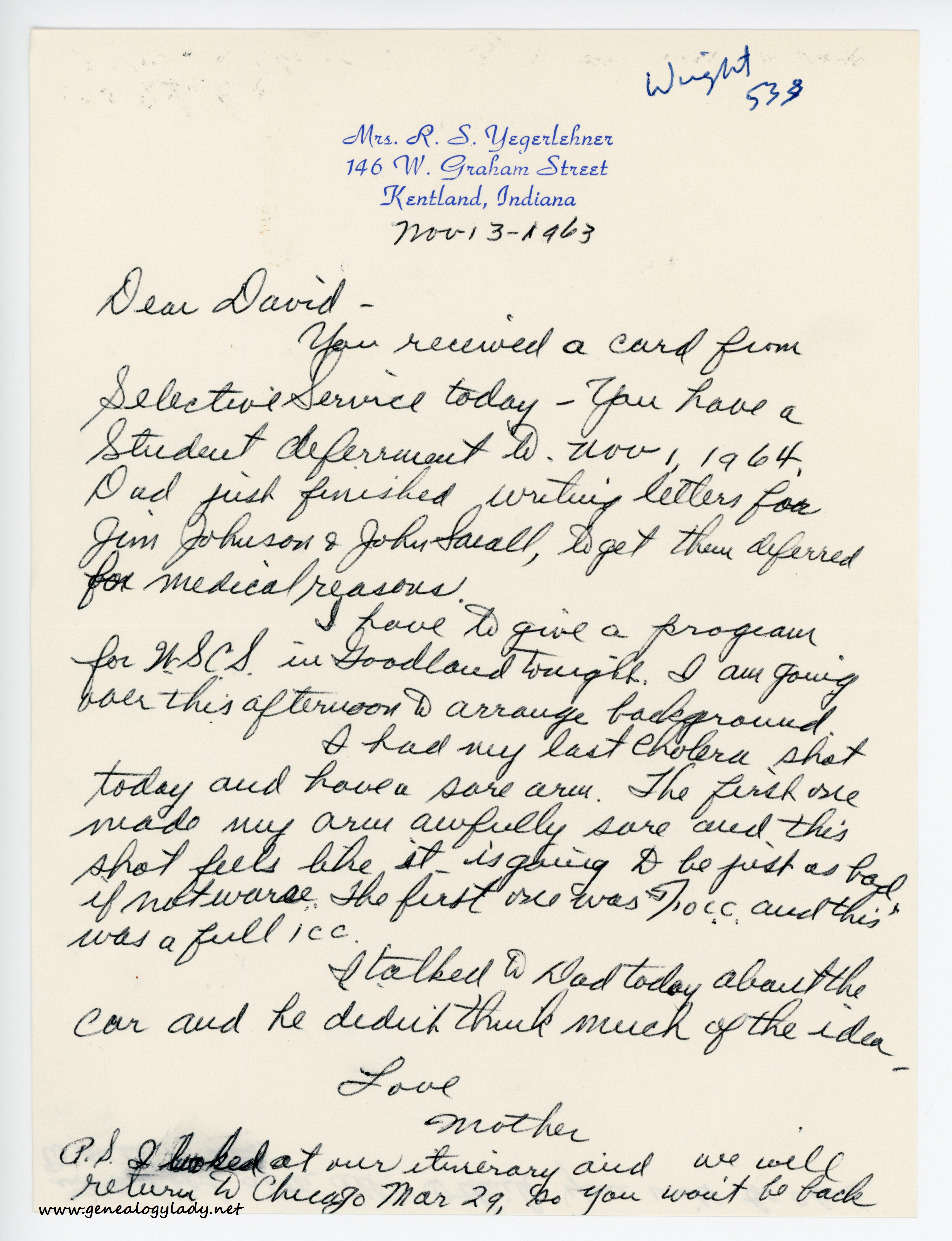 You received a card from Selective Service today – You have a Student deferment to Nov. 1, 1964. Dad just finished writing letters for Jim Johnson & John Saiall, to get them deferred for medical reasons.