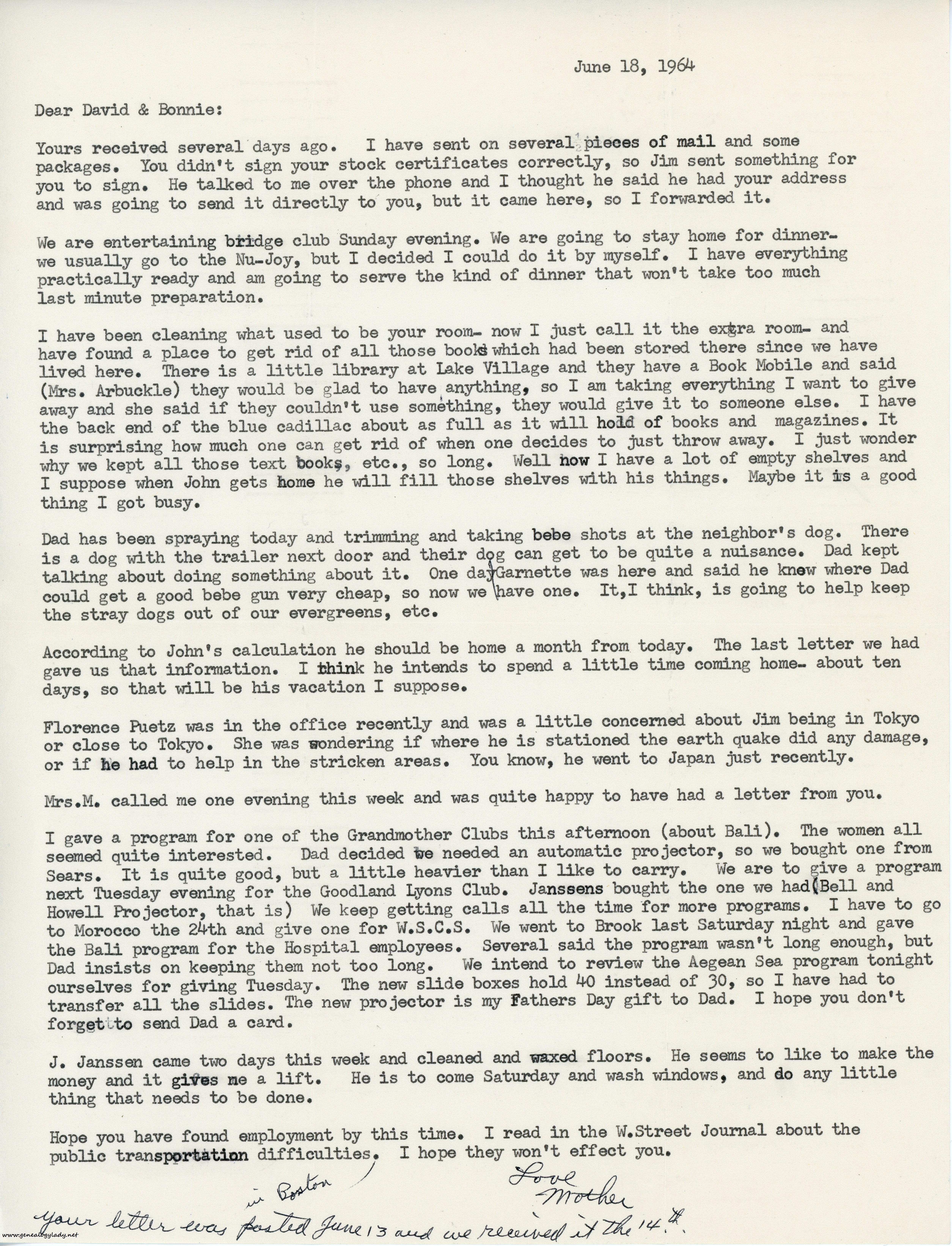 I have been cleaning what used to be your room – now I just call it the extra room – and have found a place to get rid of all those books which had been stored there since we have lived here. There is a little library at Lake Village and they have a Book Mobile and said (Mrs. Arbuckle) they would be glad to have anything, so I am taking everything I want to give away and she said if they couldn’t use something, they would give it to someone else. I have the back end of the blue Cadillac about as full as it will hold of books and magazines. It is surprising how much one can get rid of when one decides to just throw away. I just wonder why we kept all those text books, etc., so long. Well now I have a lot of empty shelves and I suppose when John gets home he will fill those shelves with his things. Maybe it is a good thing I got busy.
