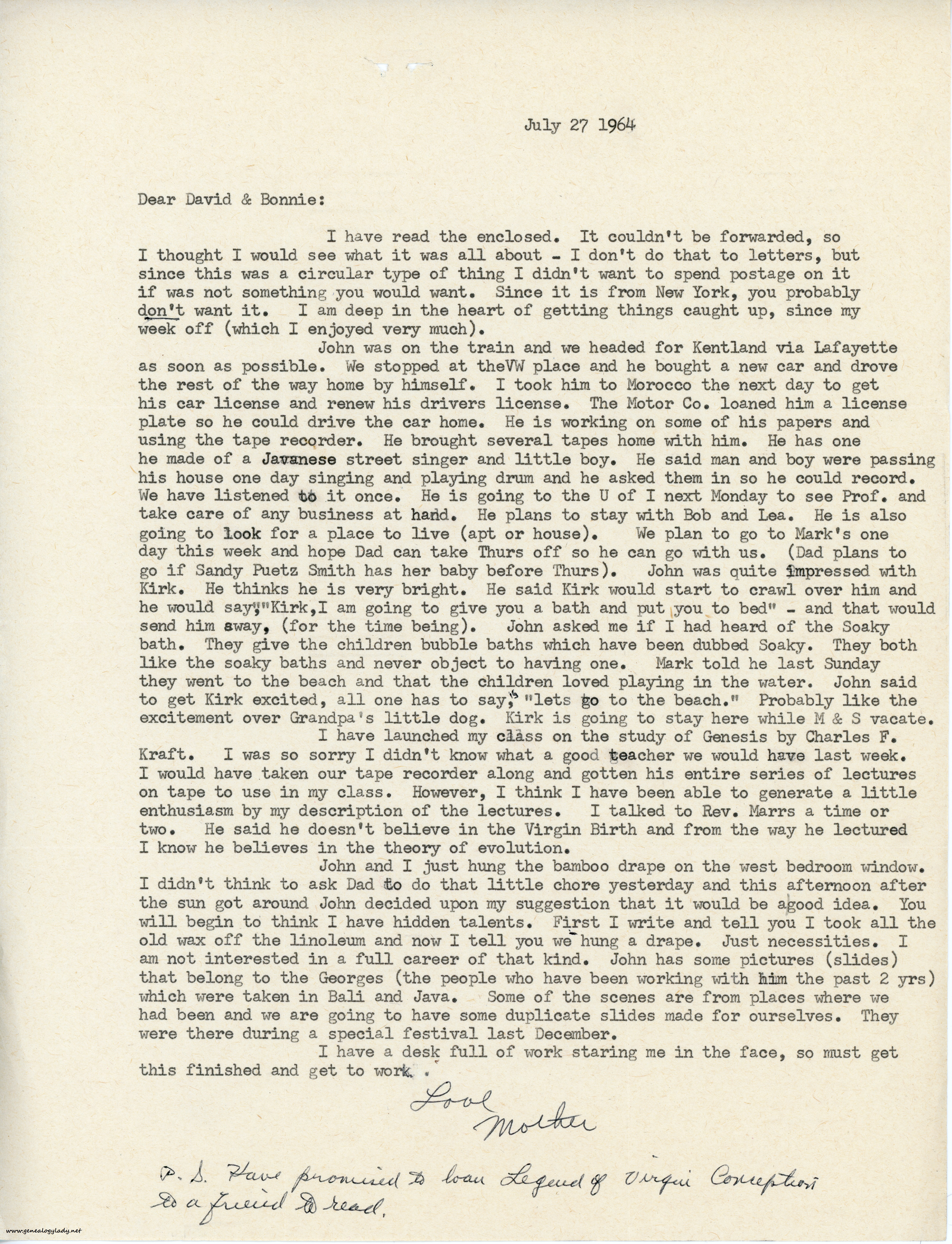 John was on the train and we headed for Kentland via Lafayette as soon as possible. We stopped at the VW place and he bought a new car and drove the rest of the way home by himself. I took him to Morocco the next day to get his car license and renew his driver’s license. The Motor Co. loaned him a license plate so he could drive the car home. He is working on some of his papers and using the tape recorder. He brought several tapes home with him. He has one he made of a Javanese street singer and little boy. He said man and boy were passing his house one day singing and playing drum and he asked then in so he could record. We have listened to it once. He is going to the U of I next Monday to see Prof. and take care of any business at hand. He plans to stay with Bob and Lea. He is also going to look for a place to live (apt or house). We plan to go to Mark’s one day this week and hope Dad can take Thurs. off so he can go with us. (Dad plans to go if Sandy Puetz Smith has her baby before Thurs). John was quite impressed with Kirk. He thinks he is very bright. He said Kirk would start to crawl over him and he would say, “Kirk, I am going to give you a bath and put you to bed” – and that would send him away, (for the time being). John asked me if I had heard of the Soaky bath. They give the children bubble baths which have been dubbed Soaky. They both like the soaky baths and never object to having one. Mark told he last Sunday they went to the beach and that the children loved playing in the water. John said to get Kirk excited, all one has to say is “Let’s go to the beach.” Probably like the excitement over Grandpa’s little dog. Kirk is going to stay here while M. & S. vacate.