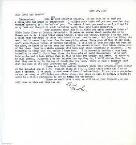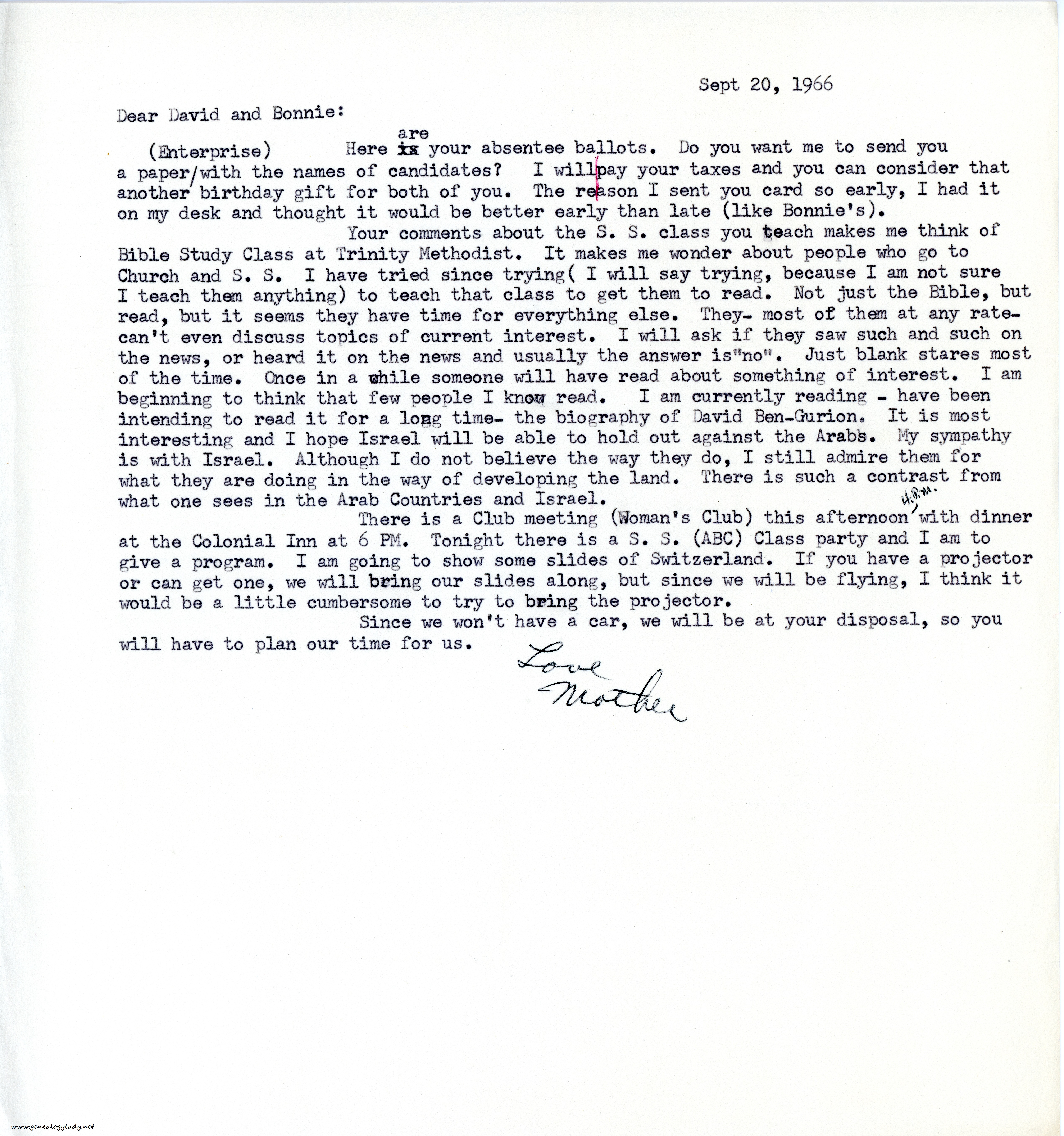 Your comments about the S. S. class you teach makes me think of Bible Study Class at Trinity Methodist. It makes me wonder about people who go to church and Sunday school. I have tried since trying (I will say trying, because I am not sure I teach them anything) to teach that class to get them to read. Not just the Bible, but read, but it seems they have time for everything else. They—most of them at any rate—can’t even discuss topics of current interest. I will ask if they saw such and such on the news, or heard it on the news and usually the answer is “no.” Just blank stares most of the time. Once in a while someone will have read about something of interest. I am beginning to think that few people I know read. I am currently reading—have been intending to read it for a long time—the biography of David Ben-Gurion. It is most interesting and I hope Israel will be able to hold out against the Arabs. My sympathy is with Israel. Although I do not believe the way they do, I still admire them for what they are doing in the way of developing a land. There is such a contrast from what one sees in the Arab countries and Israel.