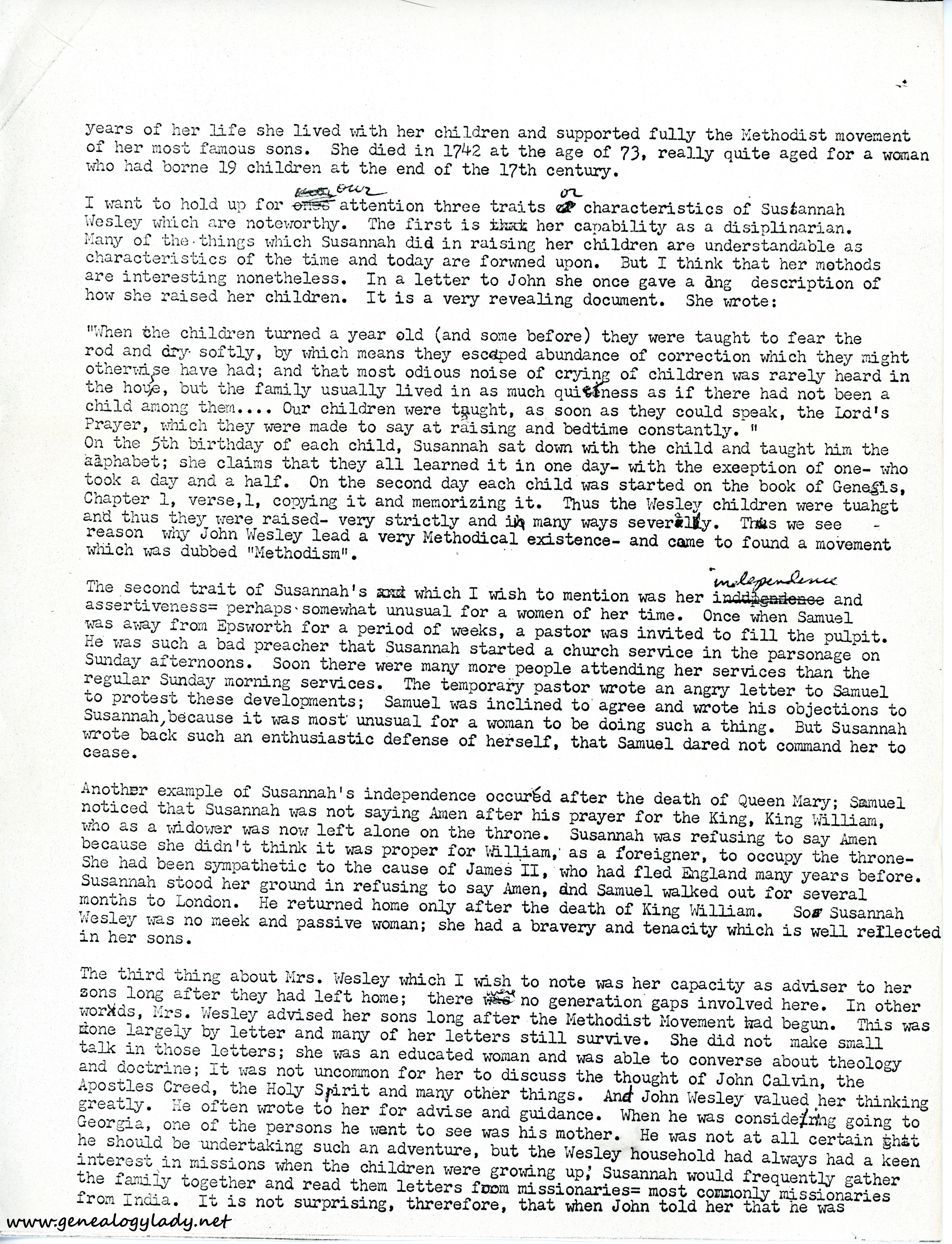[page 3] considering going to Georgia, Susannah (who was recently widowed, and might have asked her sons to stay near here) enthusiastically endorsed the idea. She exclaimed: “Had I twenty sons, I should rejoice if they were all so employed.” Her attitude might have been a significant factor in Wesley’s decision, because he did go to Georgia. So, for many years Susannah was a trusted and respected advisor to her famous son.