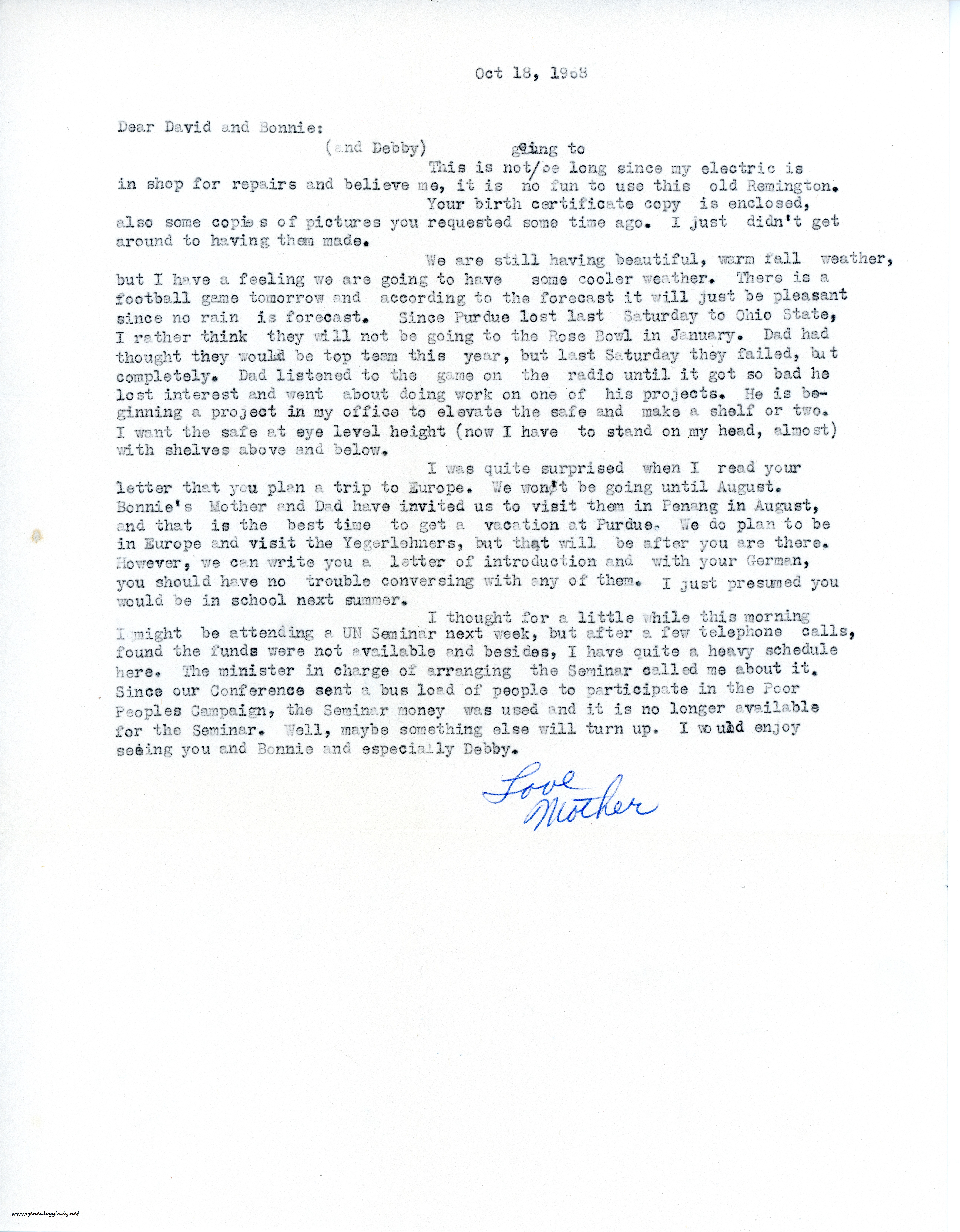 I was quite surprised when I read your letter that you plan a trip to Europe. We won’t be going until August. Bonnie’s Mother and Dad have invited us to visit them in Penang in August, and that is the best time to get a vacation at Purdue. We do plan to be in Europe and visit the Yegerlehners, but that will be after you are there. However, we can write you a letter of introduction and with your German, you should have no trouble conversing with any of them. I just presumed you would be in school next summer.