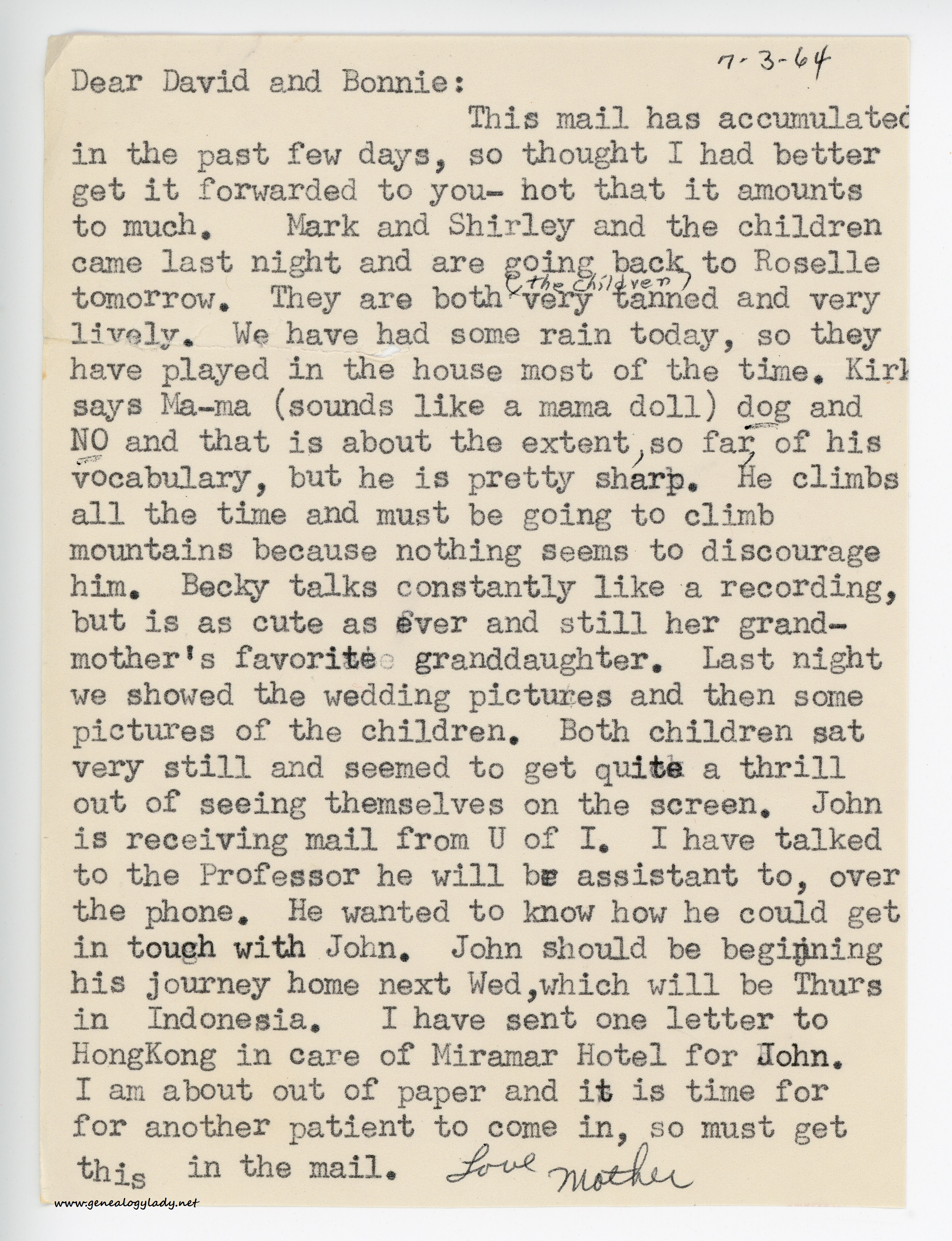Yesterday afternoon John went with me to see Aunt Ruth. We couldn’t see Uncle Earl. He has been in hospital at Joliet (we stopped at Wilmington and talked to Mrs. Johnson and she told us Ruth was at the hospital – where we thought she would be) and has had a stroke. He was quite ill when he was rushed to the hospital and since he reacts unfavorable to sedation, the Dr. had a hard time getting him quieted down. He was sleeping yesterday. We left here at 1:00 and arrived at the hospital at 3:00. We stayed with Aunt Ruth the rest of the afternoon, then took her home. Romaine had not been able to go to Wilmington because Tye was away from home on business and the woman who stays with the children was not available, but Aunt Ruth thought Tye would be back home and Romaine would be able to come any day now. Dad called the Dr. who is taking care of Uncle Earl and his report wasn’t too favorable. At a time like this I wish I could be closer to her so I could furnish transportation for her, but their friends have been very good about getting her to and from the hospital. Tye’s parents live in Wilmington and they have been very helpful.
