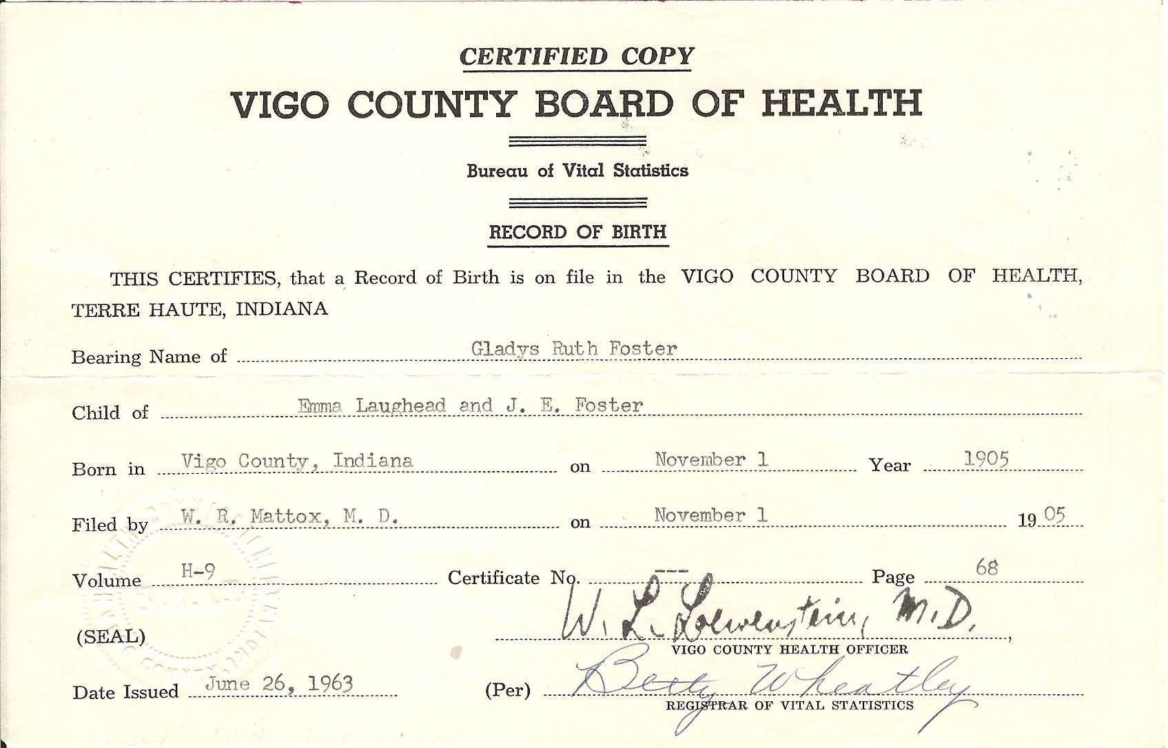 + 28 ii. MARTHA LAWHEAD, born 29 October 1886, Crawford County, Illinois; married Everett Bradford McGovern; died 29 January 1969, Robinson, Crawford County, Illinois.