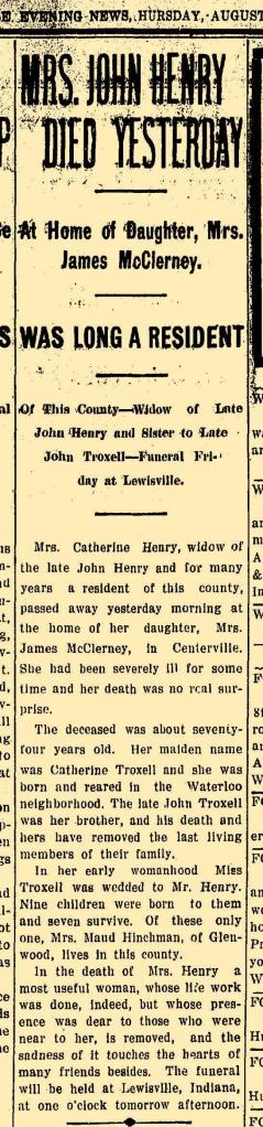 [3] Fayette County, Indiana, Marriage , v. 1: 133, John C. Henry and Mary Troxell, 1860; “Indiana Marriages, 1811-2019,” database and images, FamilySearch (https://www.familysearch.org : accessed 26 February 2023), FHL film #004,540,515, image 100/710. Also, “Dies Many Years After Accident,” obituary, Rushville Republican (Rushville, Indiana), 6 April 1911, p. 4, col. 4; digital image, Newspapers.com (https://www.newspapers.com : accessed 26 February 2023).