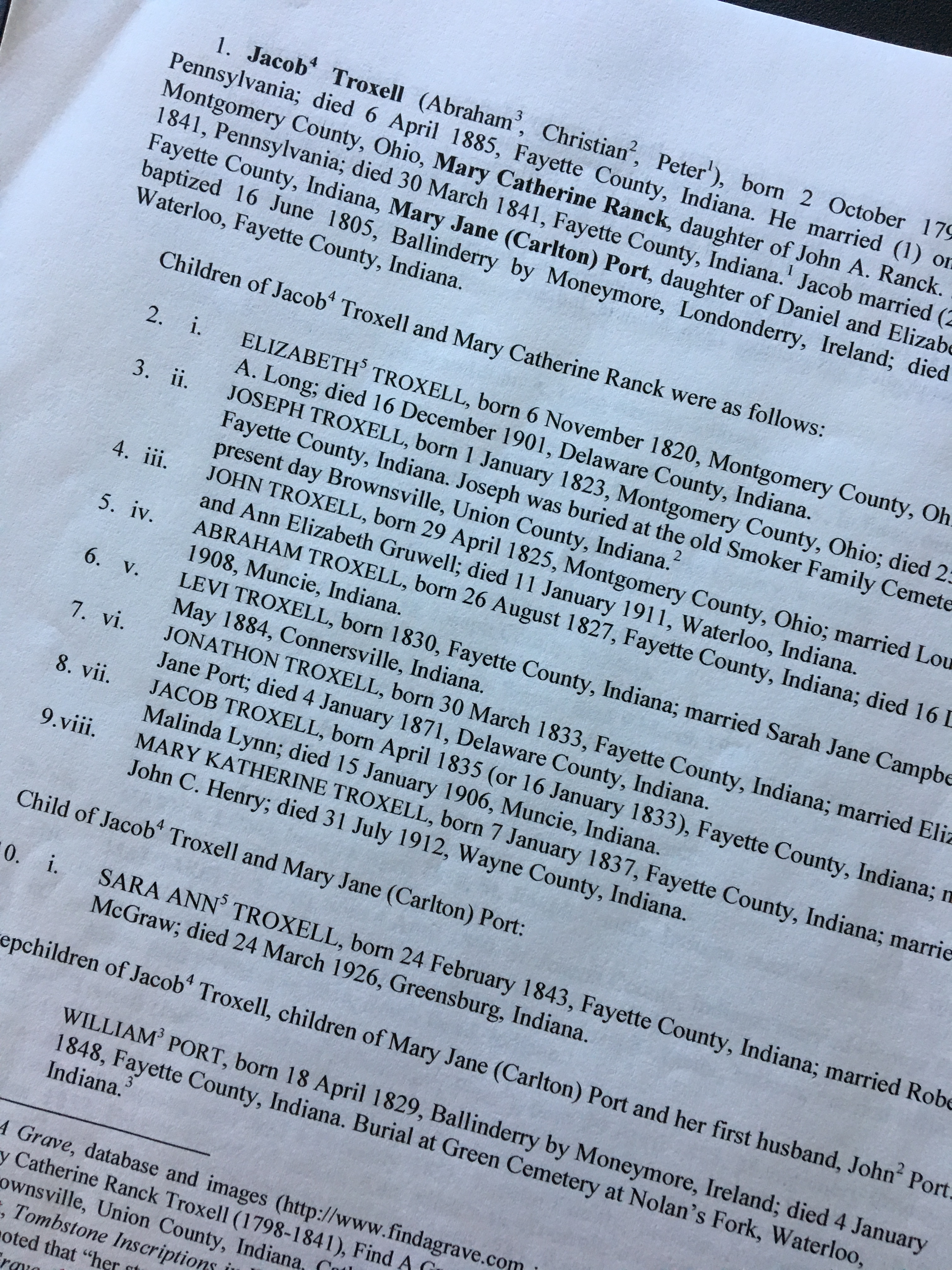 This genealogical summary is part of a larger work on the descendants of Jacob Troxell (1797-1885) of Fayette County, Indiana. An earlier work was published in 1998. These summaries are part of a new publication which is in progress. Mary Catherine Troxell was the eighth and youngest child of Jacob Troxell and his first wife, Mary Catherine (Ranck) Troxell. She was his second daughter.
