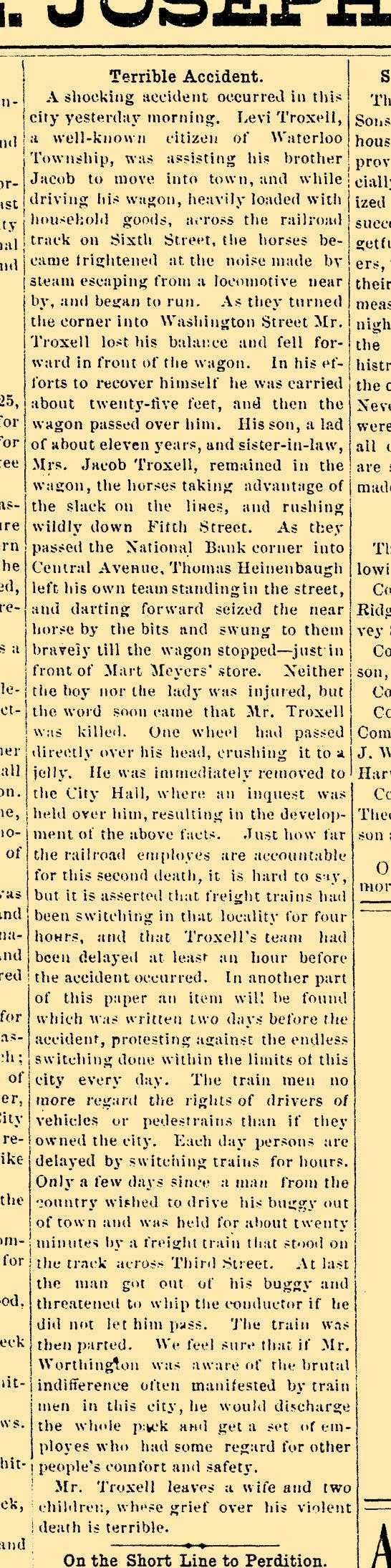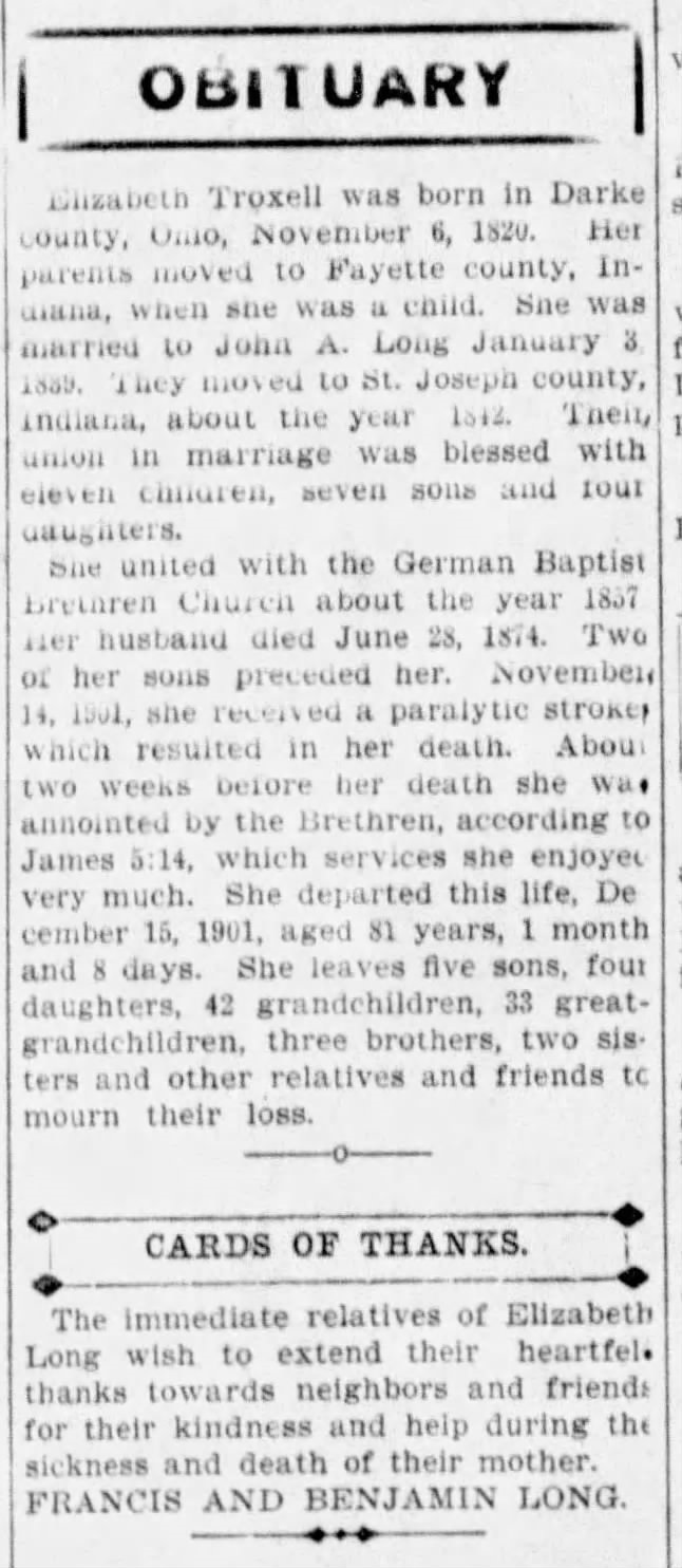 [3] Fayette County, Indiana, Marriage , v. 1: 133, John C. Henry and Mary Troxell, 1860; “Indiana Marriages, 1811-2019,” database and images, FamilySearch (https://www.familysearch.org : accessed 26 February 2023), FHL film #004,540,515, image 100/710. Also, “Dies Many Years After Accident,” obituary, Rushville Republican (Rushville, Indiana), 6 April 1911, p. 4, col. 4; digital image, Newspapers.com (https://www.newspapers.com : accessed 26 February 2023).
