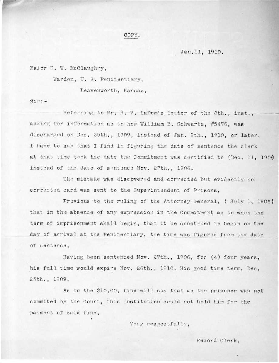 Letter from the Record Clerk to Warden Robert W. McClaughry, 11 January 1910, William B. Schwartz, Prisoner no. 5476; Inmate Case Files, U. S. Penitentiary, Leavenworth, Kansas, 1895-1931, Record Group 129; National Archives at Kansas City, Missouri
