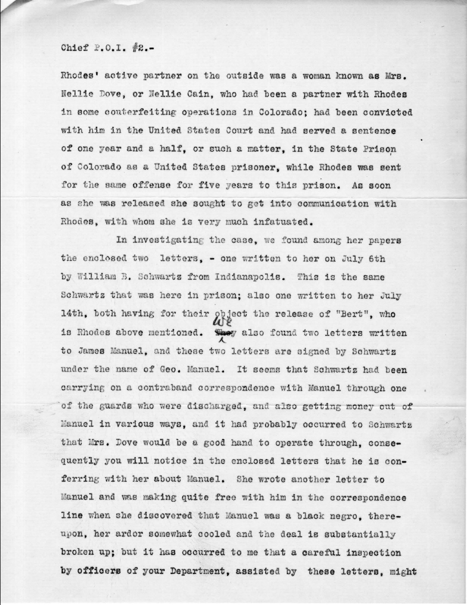 Rhodes’ active partner on the outside was a woman known as Nellie Dove, or Nellie Cain, who had been a partner with Rhodes in some counterfeiting operations in Colorado; had been convicted with him in the United States Court and had served a sentence of one year and a half, or such a matter, in the State Prison of Colorado as a United States Prisoner, while Rhodes was sent for the same offense for five years to this prison. As soon as she was released she sought to get into communication with Rhodes, with whom she is very much infatuated.