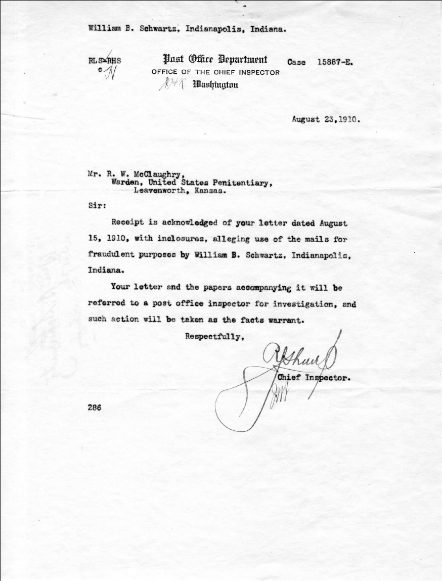 Letter from Chief Post Office Inspector, Robert S. Sharp, to Warden, R. W. McClaughry, 23 August 1910, William B. Schwartz, Prisoner no. 5476; Inmate Case Files, U. S. Penitentiary, Leavenworth, Kansas, 1895-1931, Record Group 129; National Archives at Kansas City, Missouri.