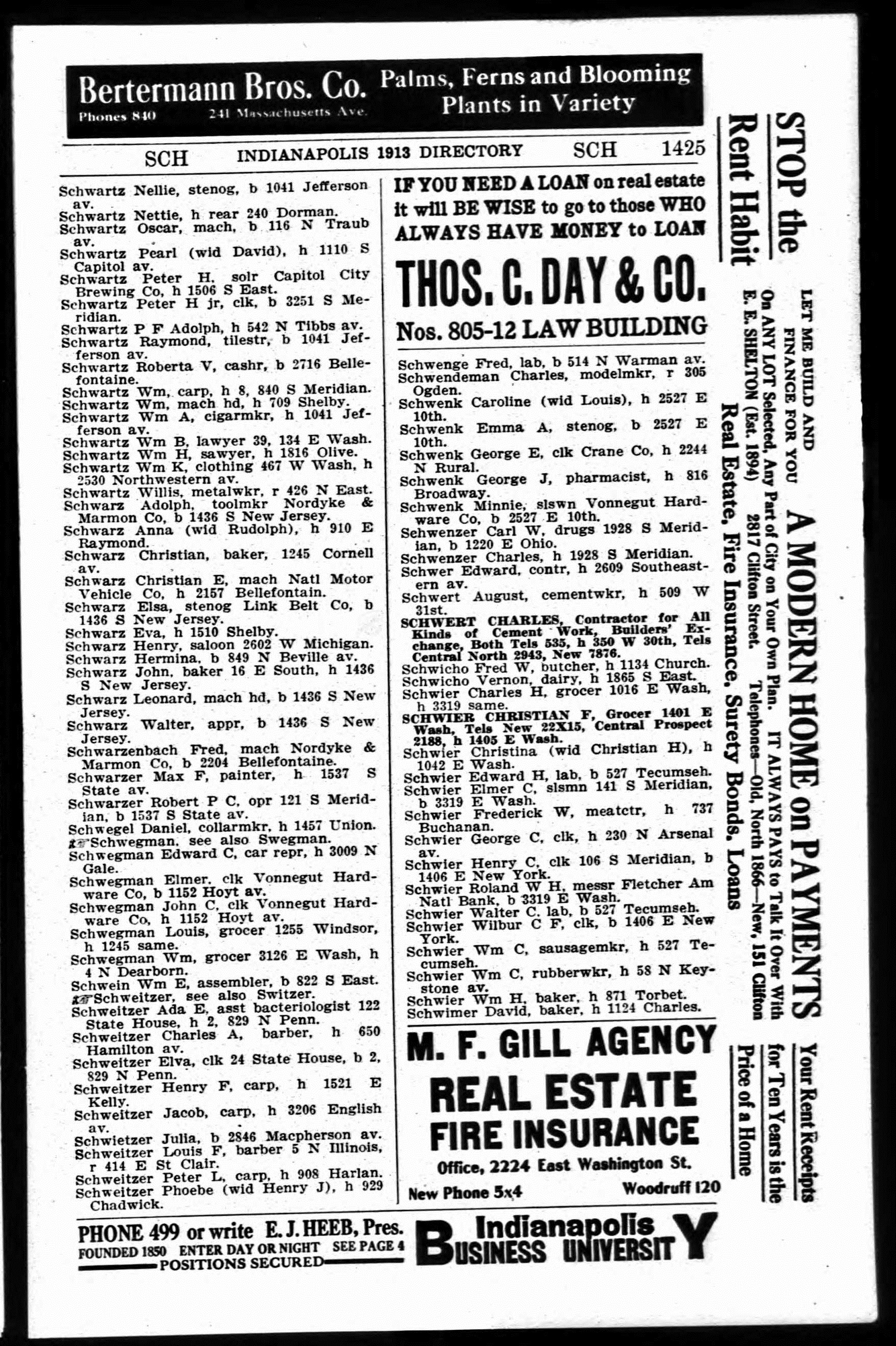 “U.S. City Directories, 1821-1989,” digital image, Ancestry.com (http://www.ancestry.com : accessed 5 May 2014), Indianapolis (1913), Wm B. Schwartz and Roberta V. Schwartz.